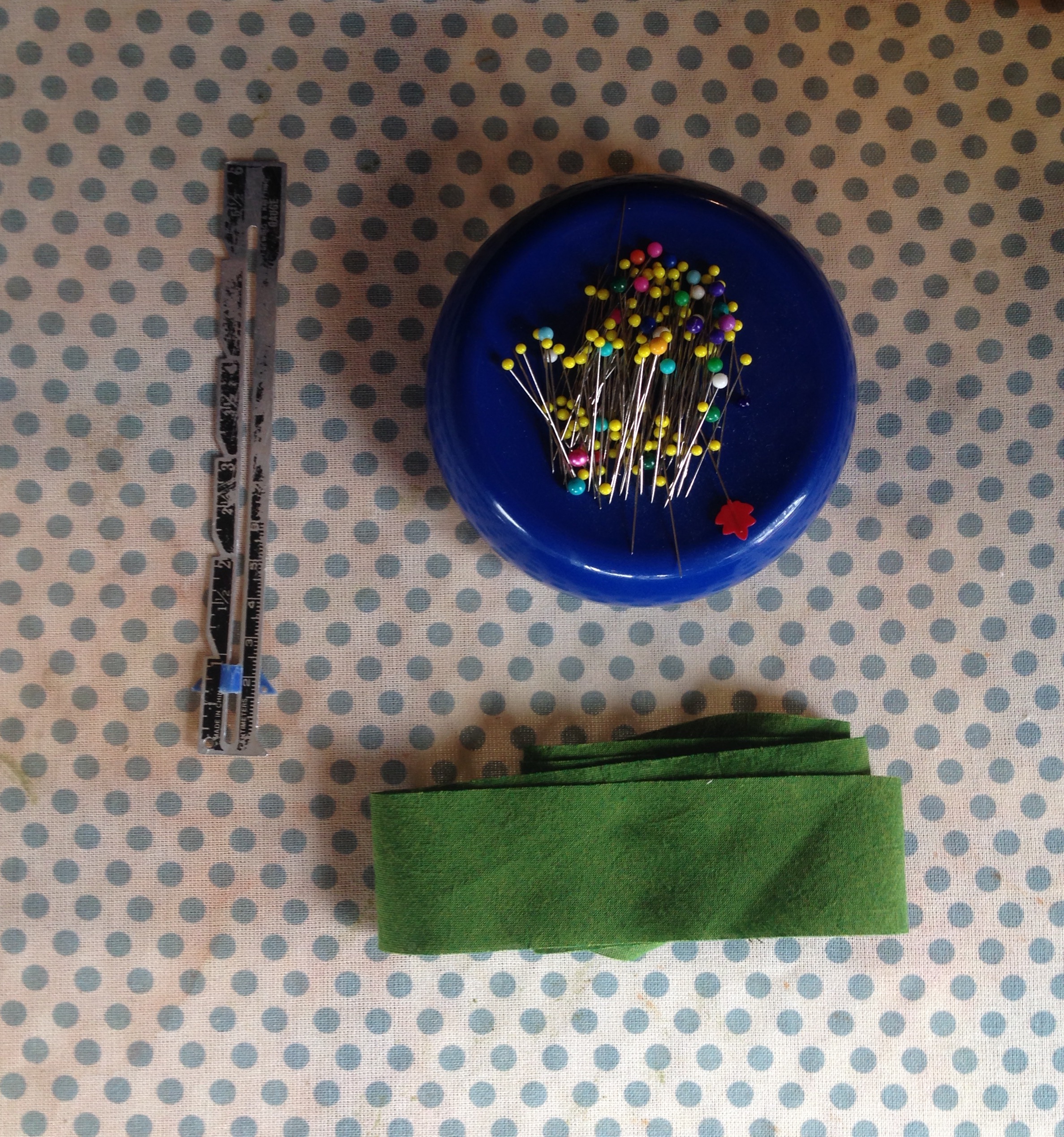 All you'll need are some basic sewing tools: pins, a tape measure or seam gauge, iron, ironing board with cloth cover, and of course your bias cut strip of fabric. I cut my fabric at 1.5" wide to make .75" wide single fold bias tape.
