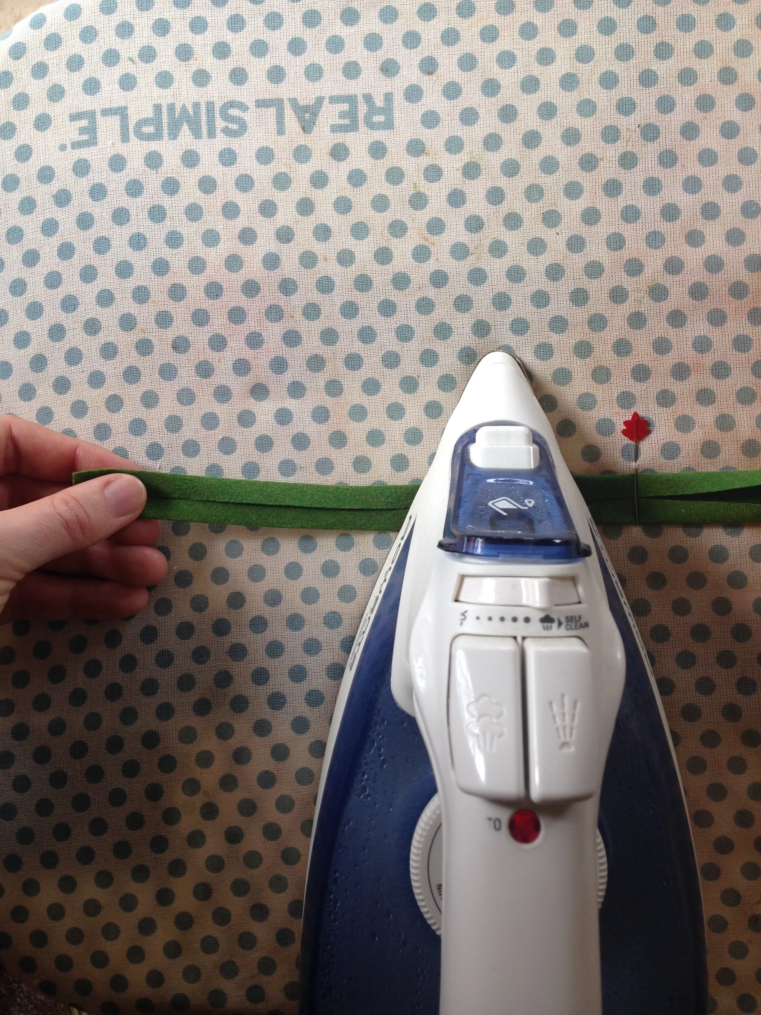 Pull some more bias tape through the pin, place your iron over the bias tape just to the side of the pin, and keep pulling! Go slowly and use your other hand to manipulate the bias tape about to go through the pin. Some fabrics require more manhandling than others. Also be aware of how long your iron has been face down. I like to lift my iron every 20-30 seconds.