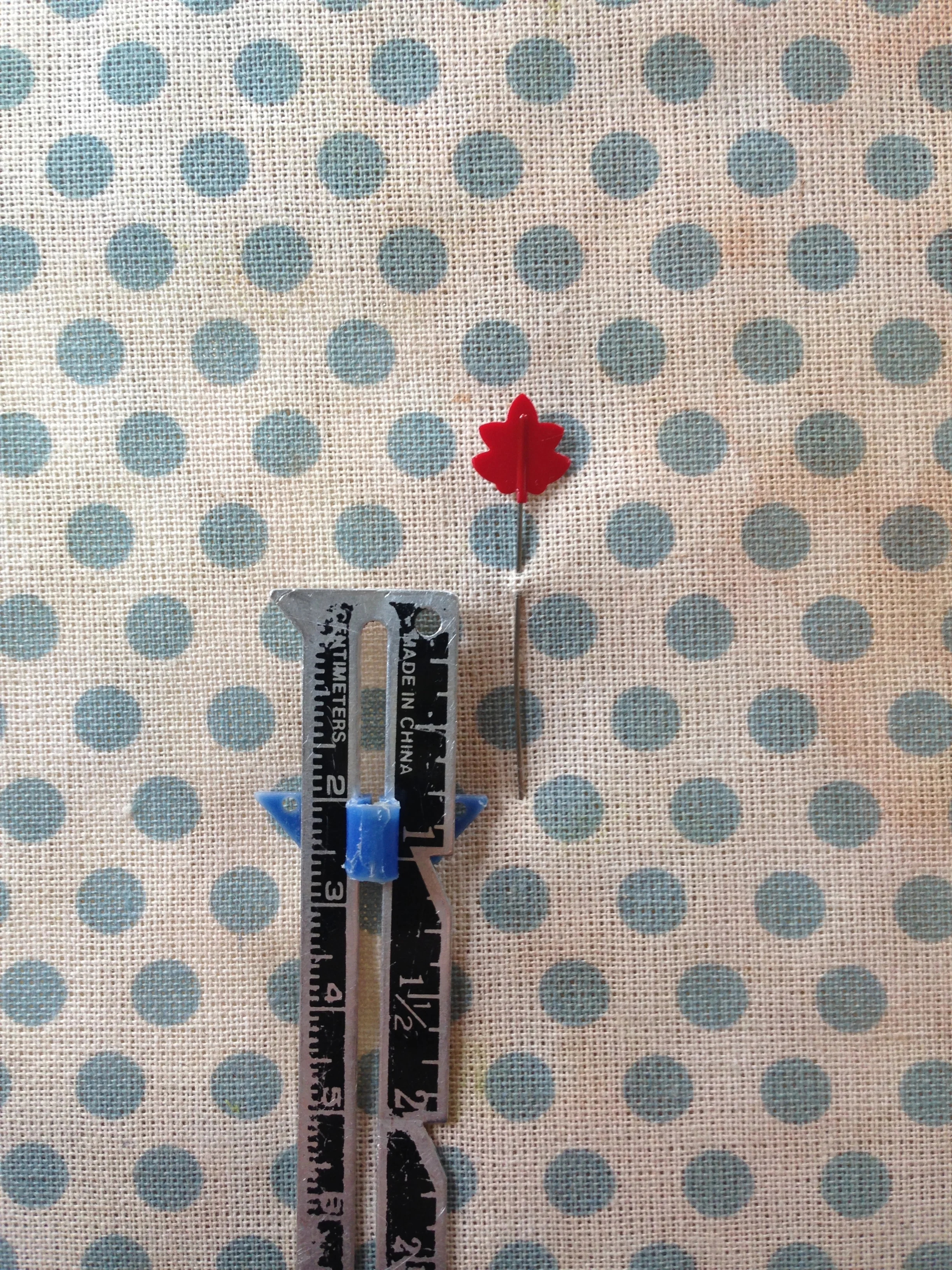 To start you'll put a pin through your ironing board cover once. Starting from where the pin emerges from the ironing board, measure .75" (or whatever you want the finished size of your bias tape to be - you can use a large safety pin if making wider tape) and put the end of the pin through the ironing board cover at that point. (This part is a little bit tricky to explain, but I think the picture shows your end goal.)