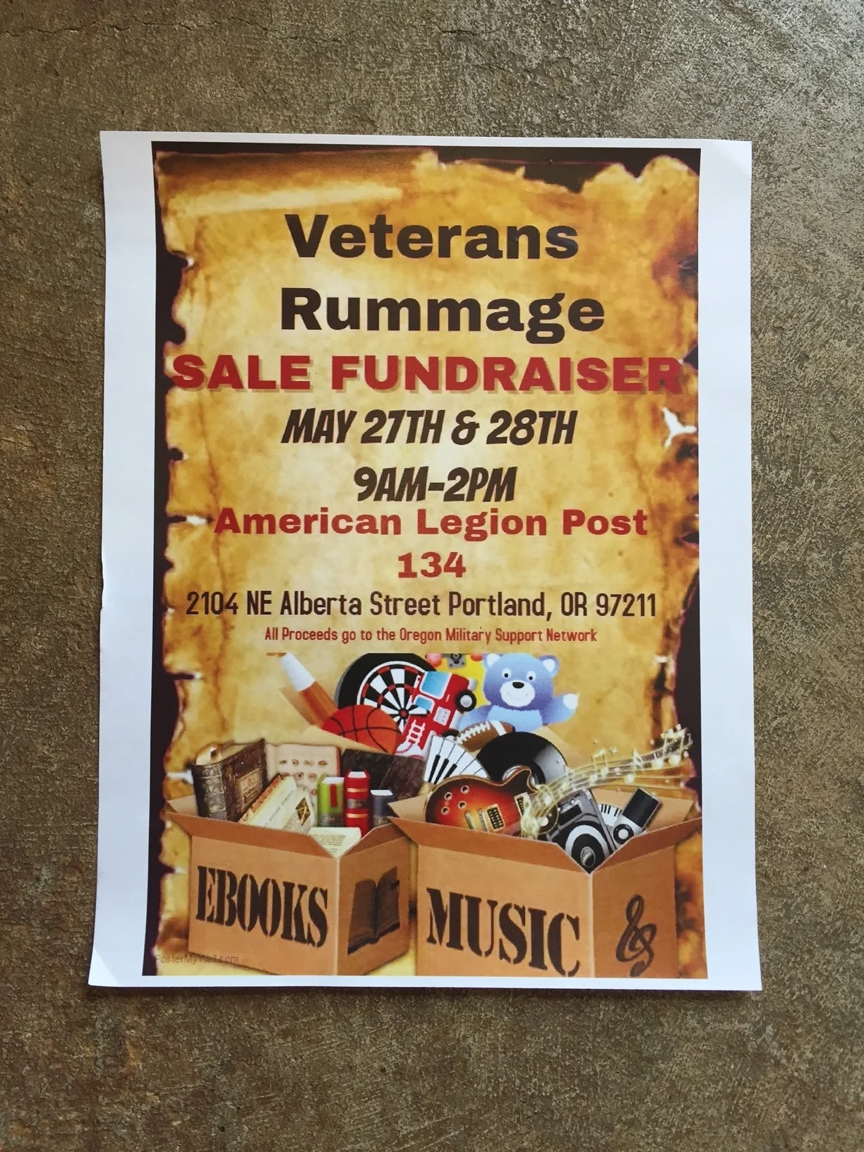 The other event happening this weekend that we want to share is the rummage sale happening at the American Legion Post 134, just down the block at 21st. The proceeds will go to the Oregon Military Support Network. Their guidelines: items must be clean and usable. Please no broken stuff. Please no old tube TVs. Receipts are available for any donation. They will be BBQ-ing out front both days too! A great opportunity to clear out some unused items and find some things you can use.