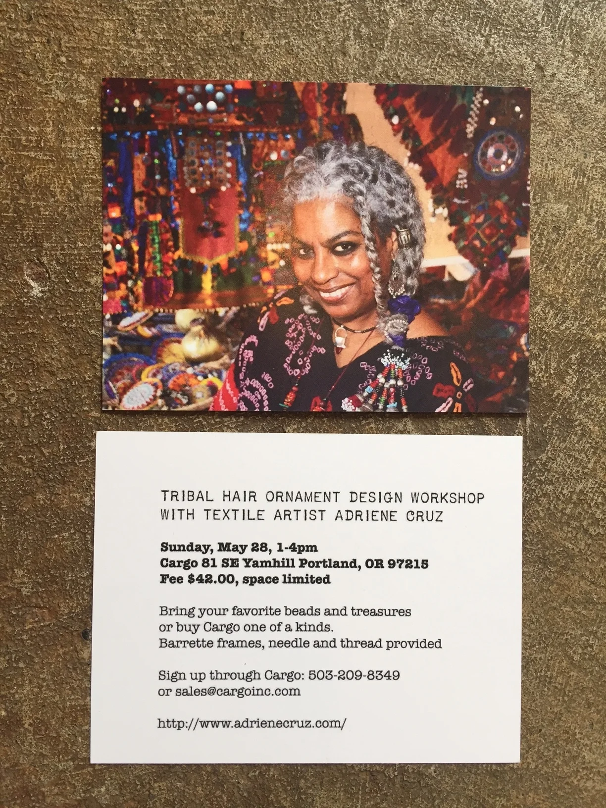 Textile artist Adriene Cruz is holding a workshop this Sunday, "Tribal Hair Ornament Design" at Cargo. See all the details below. Adriene is an incredible artist, and overall delightful person. This workshop is sure to be a great time.