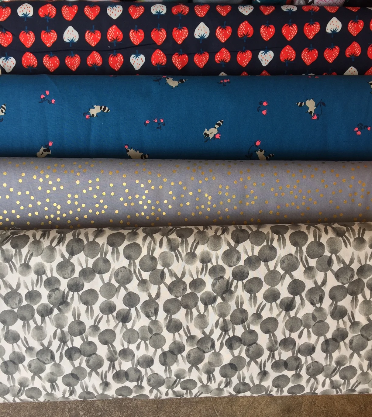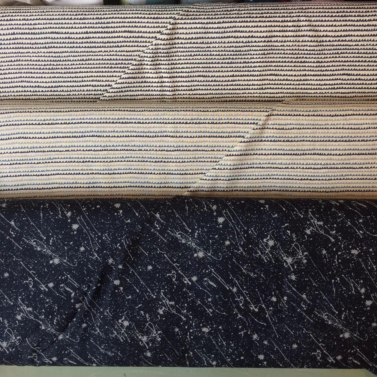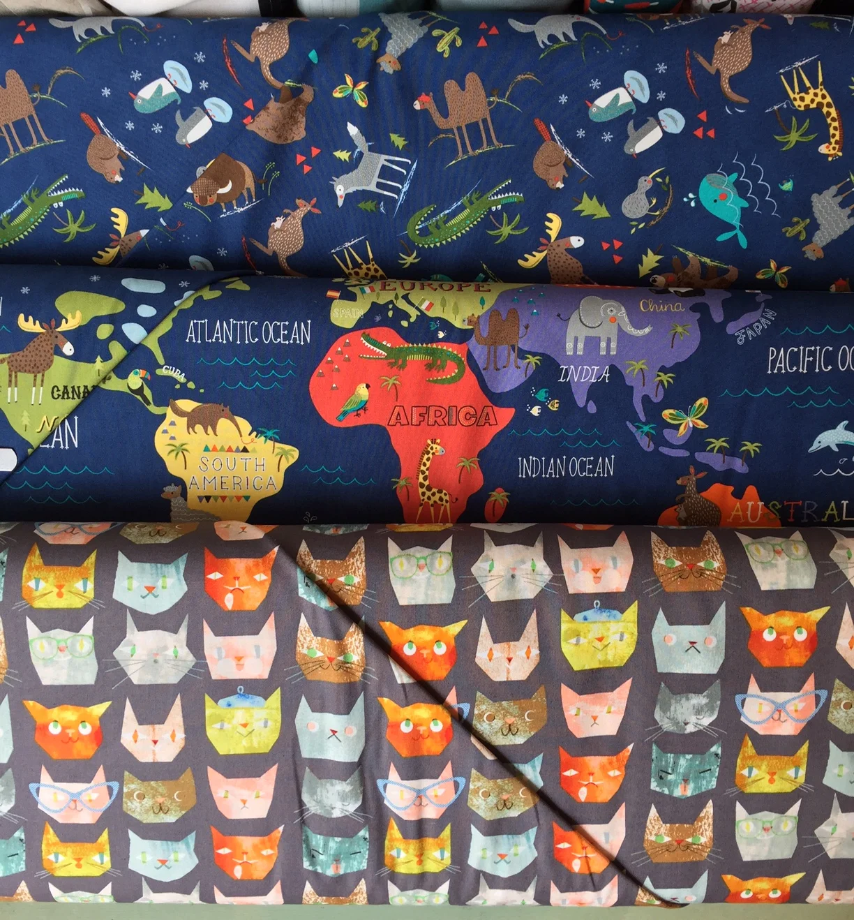 Lovely, contemporary navy prints from Moda, along with cute kid prints from Moda and Windham. So many cat prints these days.