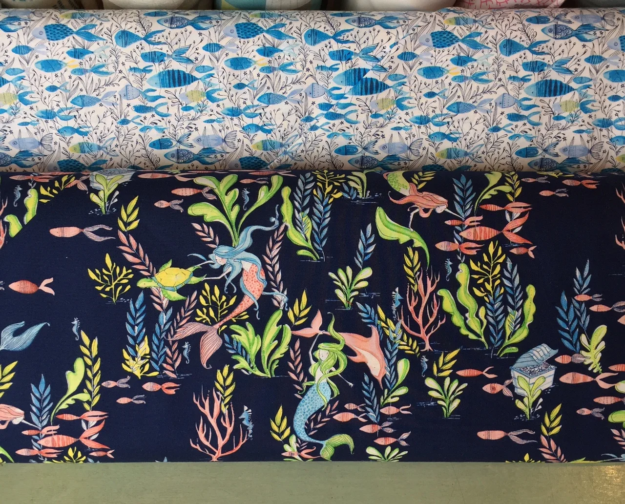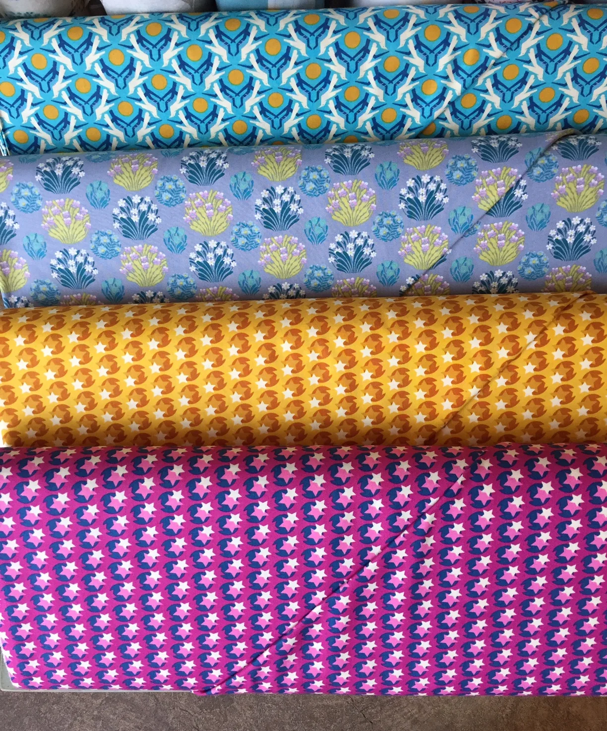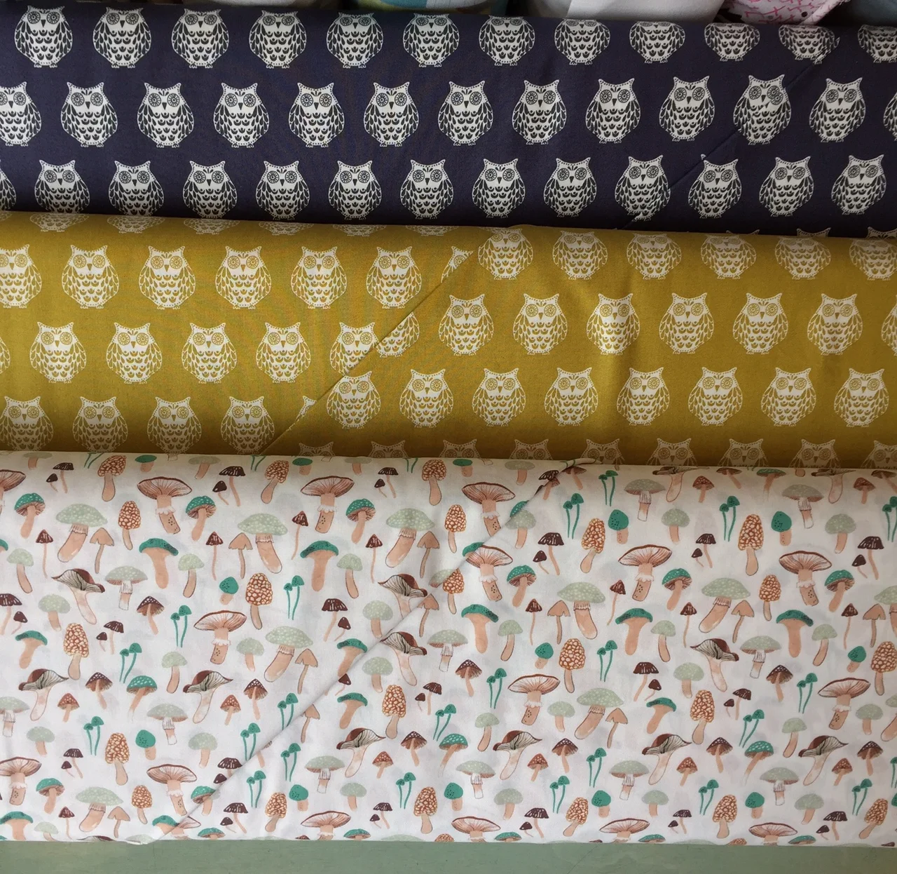 An aquatic pair from Blend Fabrics, Owls from Makower UK and sweet, teal-accented mushrooms from Dear Stella.