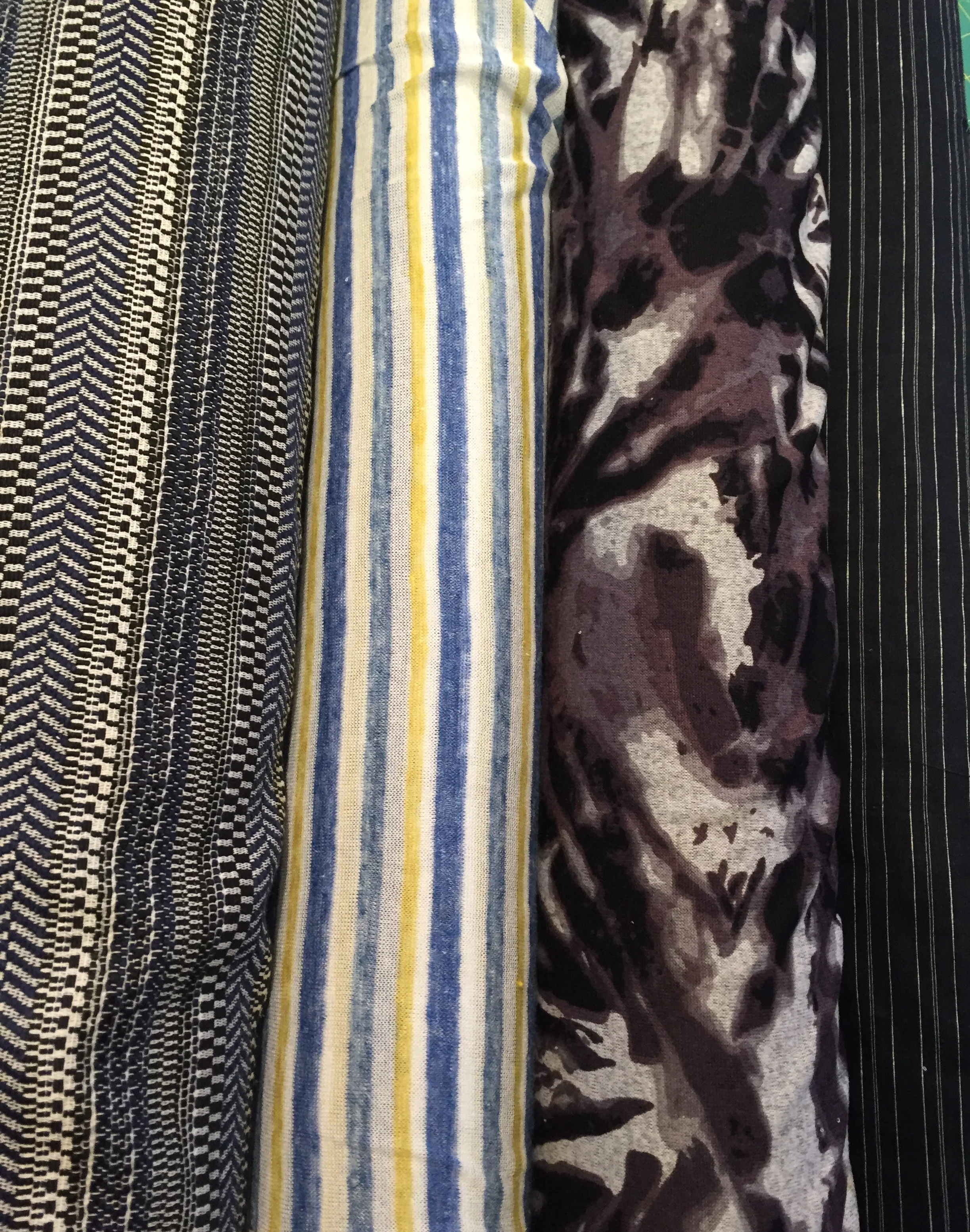 A very wide variety of apparel goods arrived yesterday, including a textured, woven cotton blend, a summery stripey linen knit, a wild gray-scale knit and a subdued black cotton/ linen pinstripe.