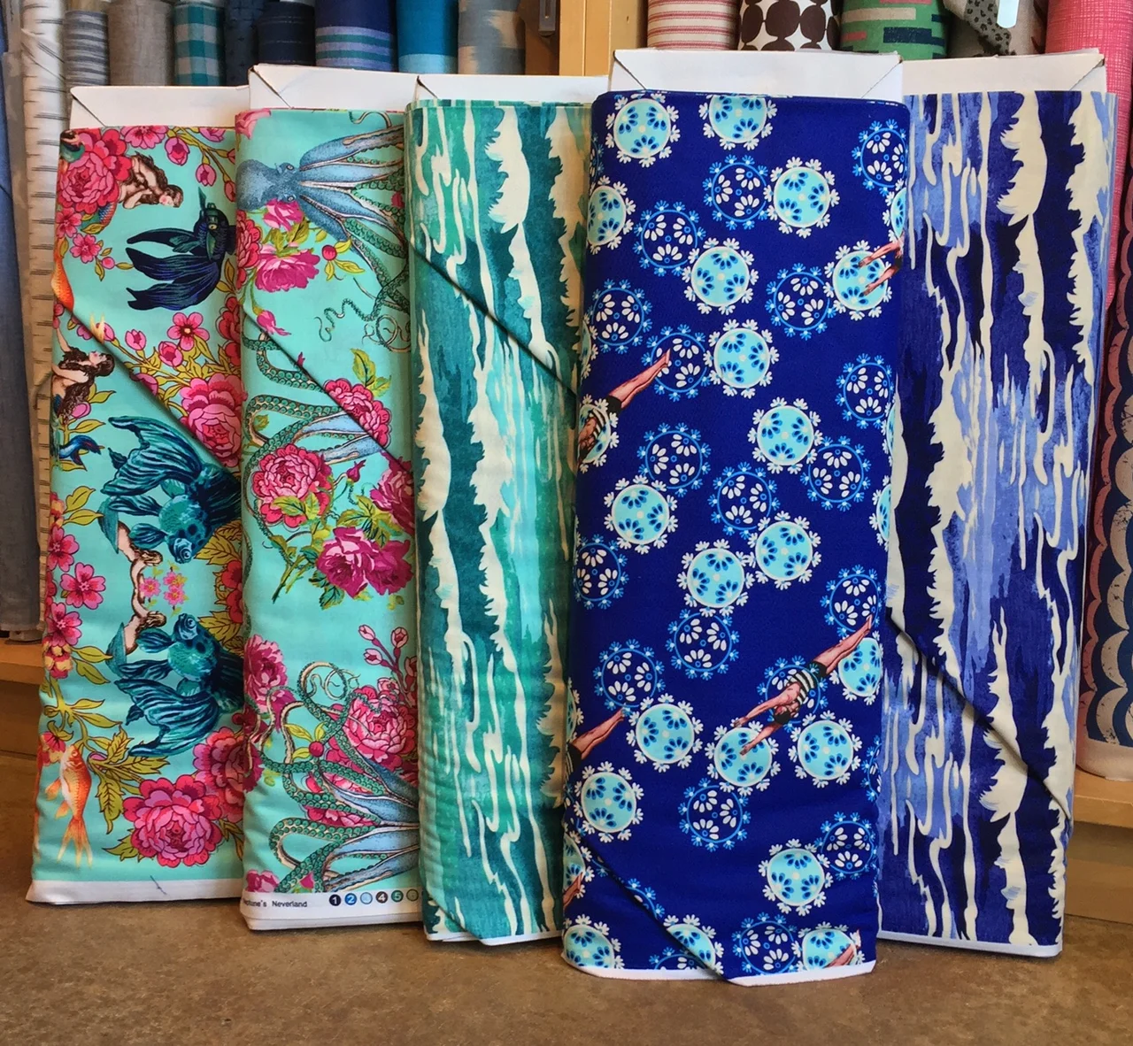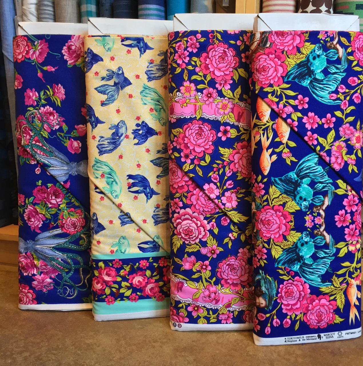 Margot Elena of Tokyo Milk is responsible for these eclectic, retro and super color-rich designs for Free Spirit Fabrics. Neptune and the Mermaid is also the name of a perfume line by this brand. Check it out here.