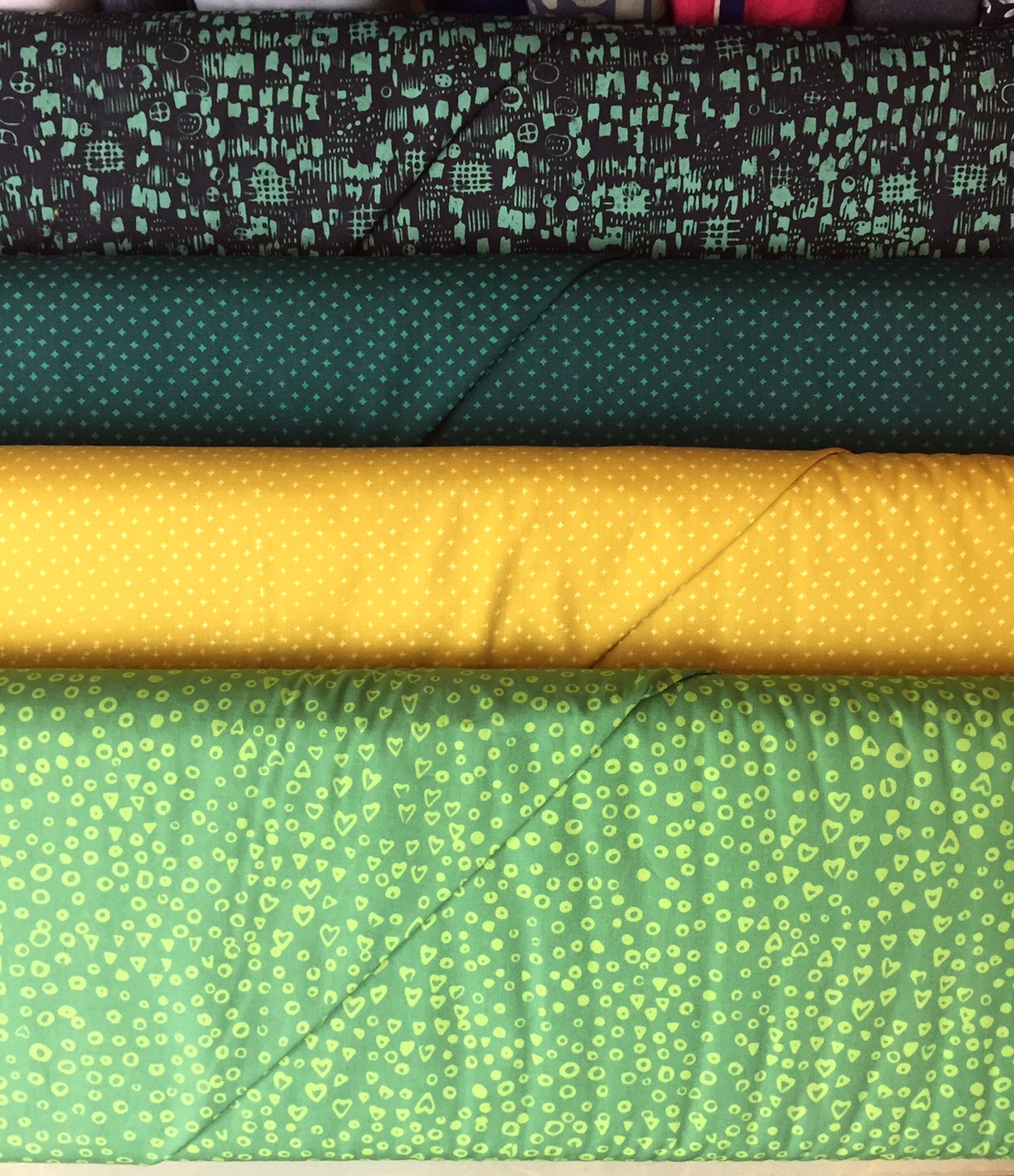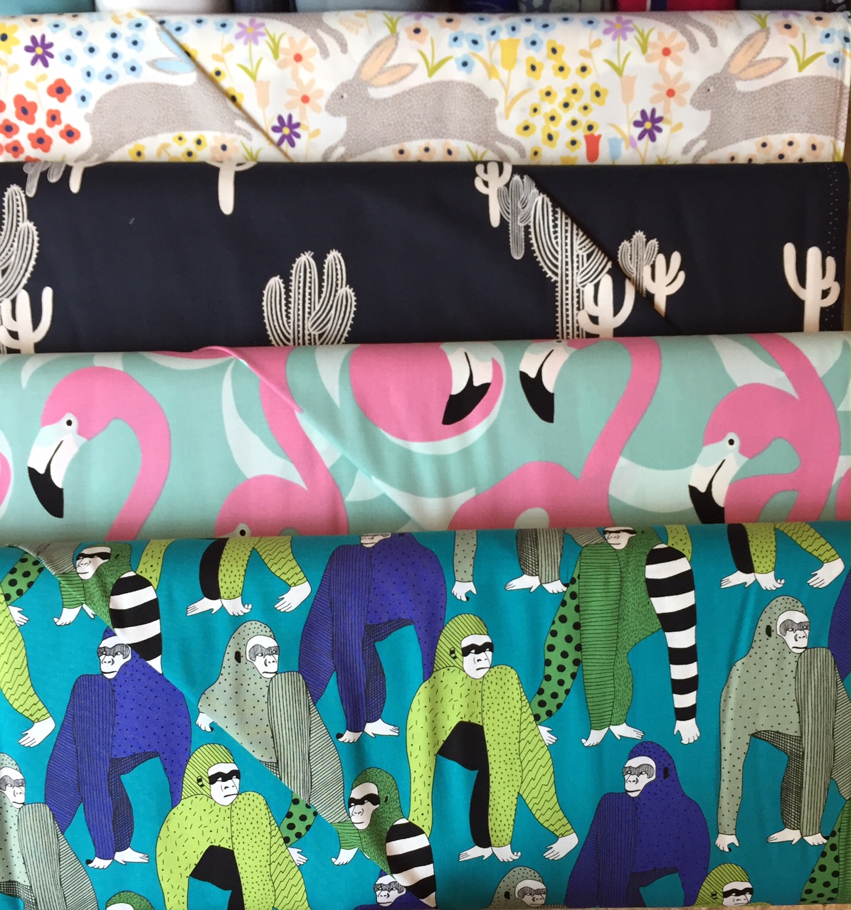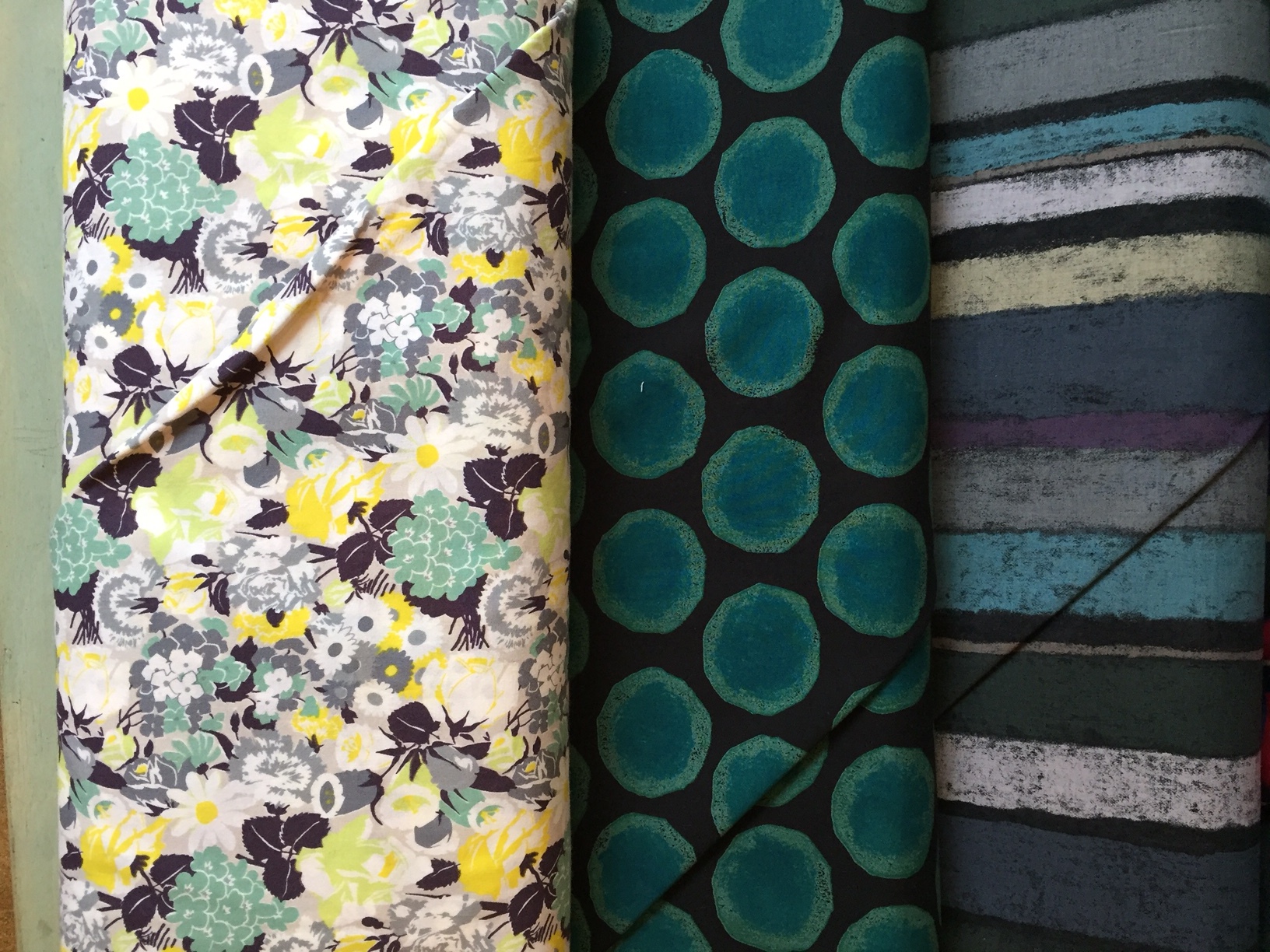 cotton and rayon knits, the three on the right are the plush, soft cotton / stretch blend from Art Gallery that we have been falling in love with.