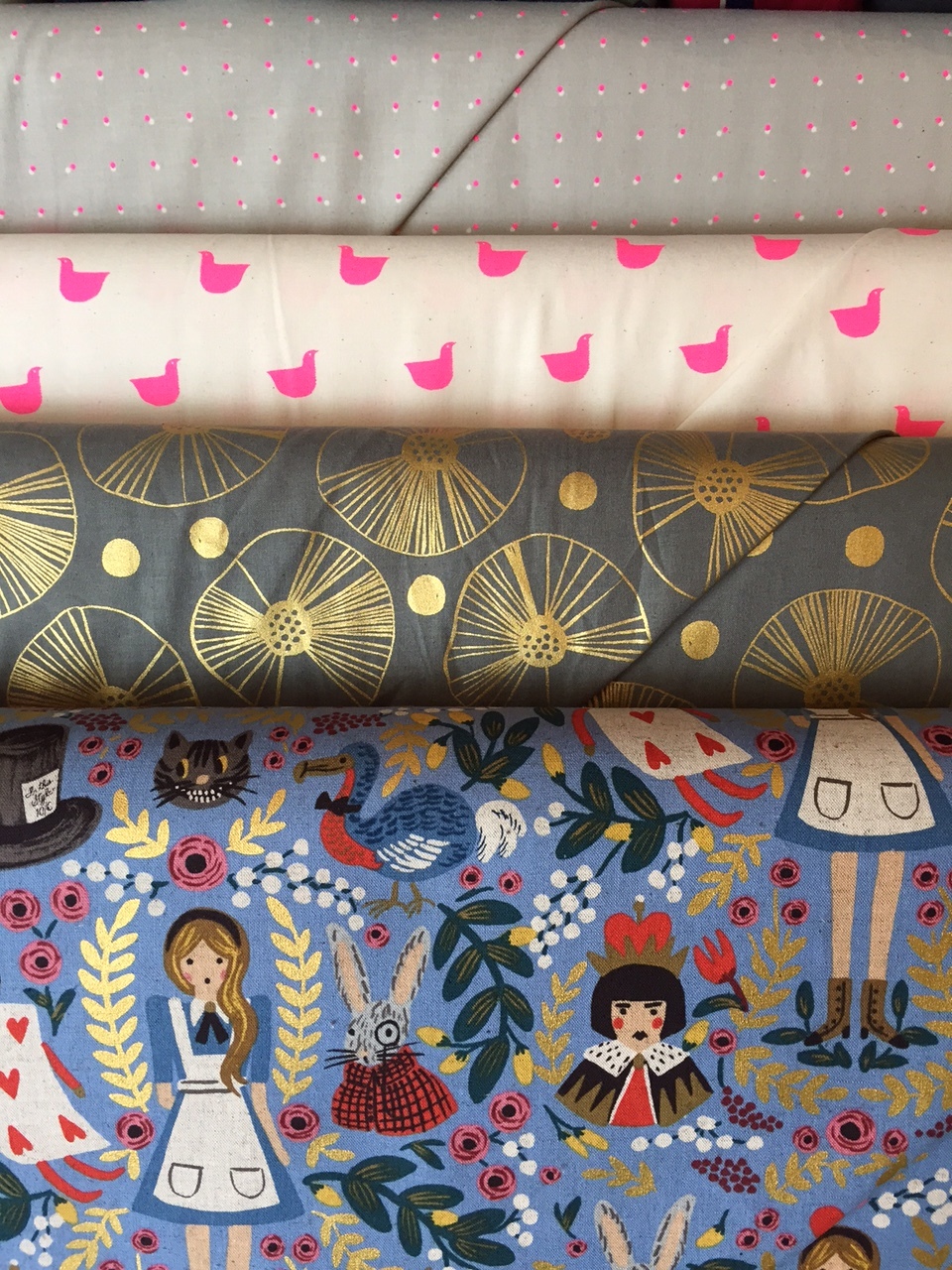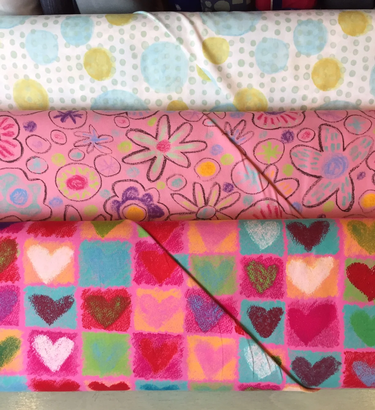 A group of Japanese cotton prints include this adorable "flower delivery" print, crayon hearts and soft cotton lawn.
