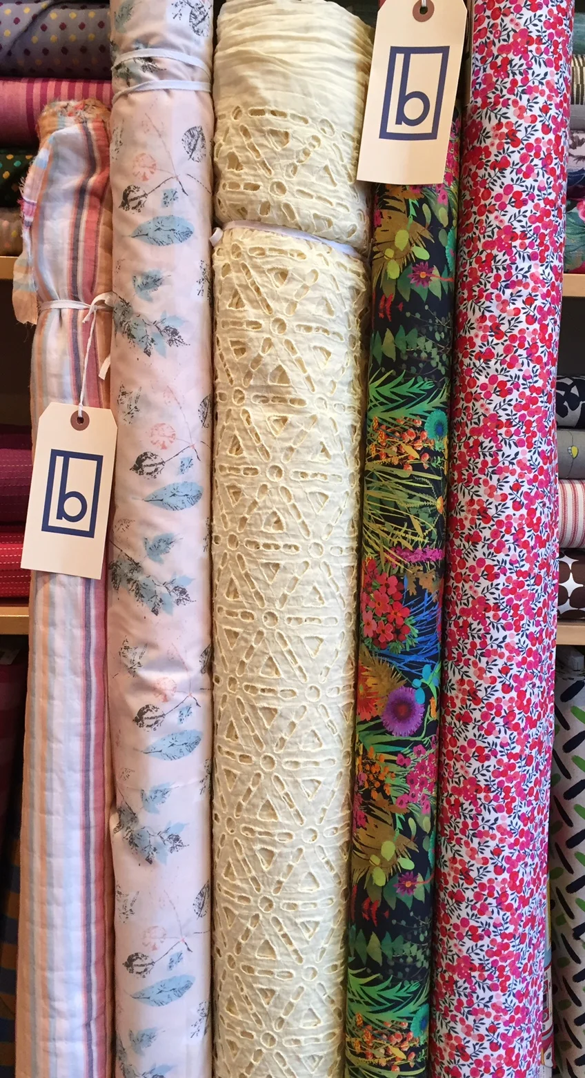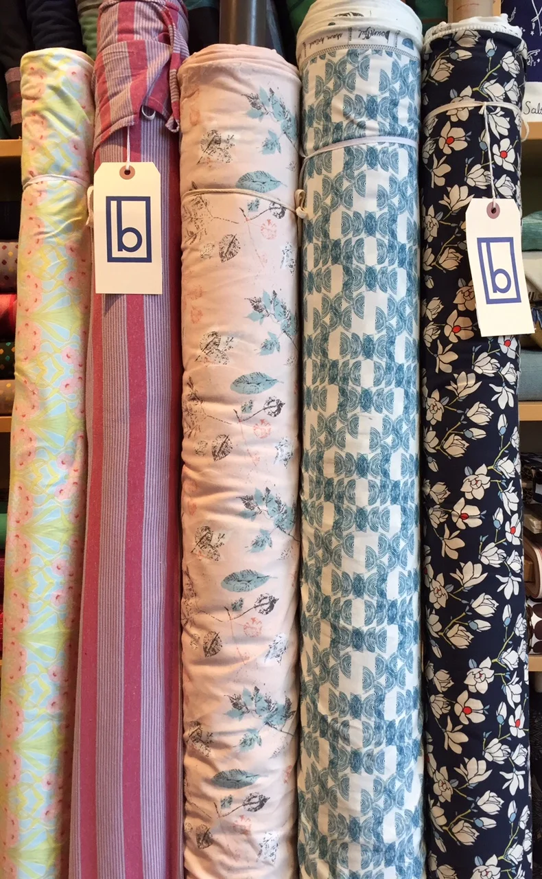 A variety of cottons, from super light weight stripe and softly colored cotton lawn on the far left, to a stretch cotton poplin from Liberty of London on the far right.