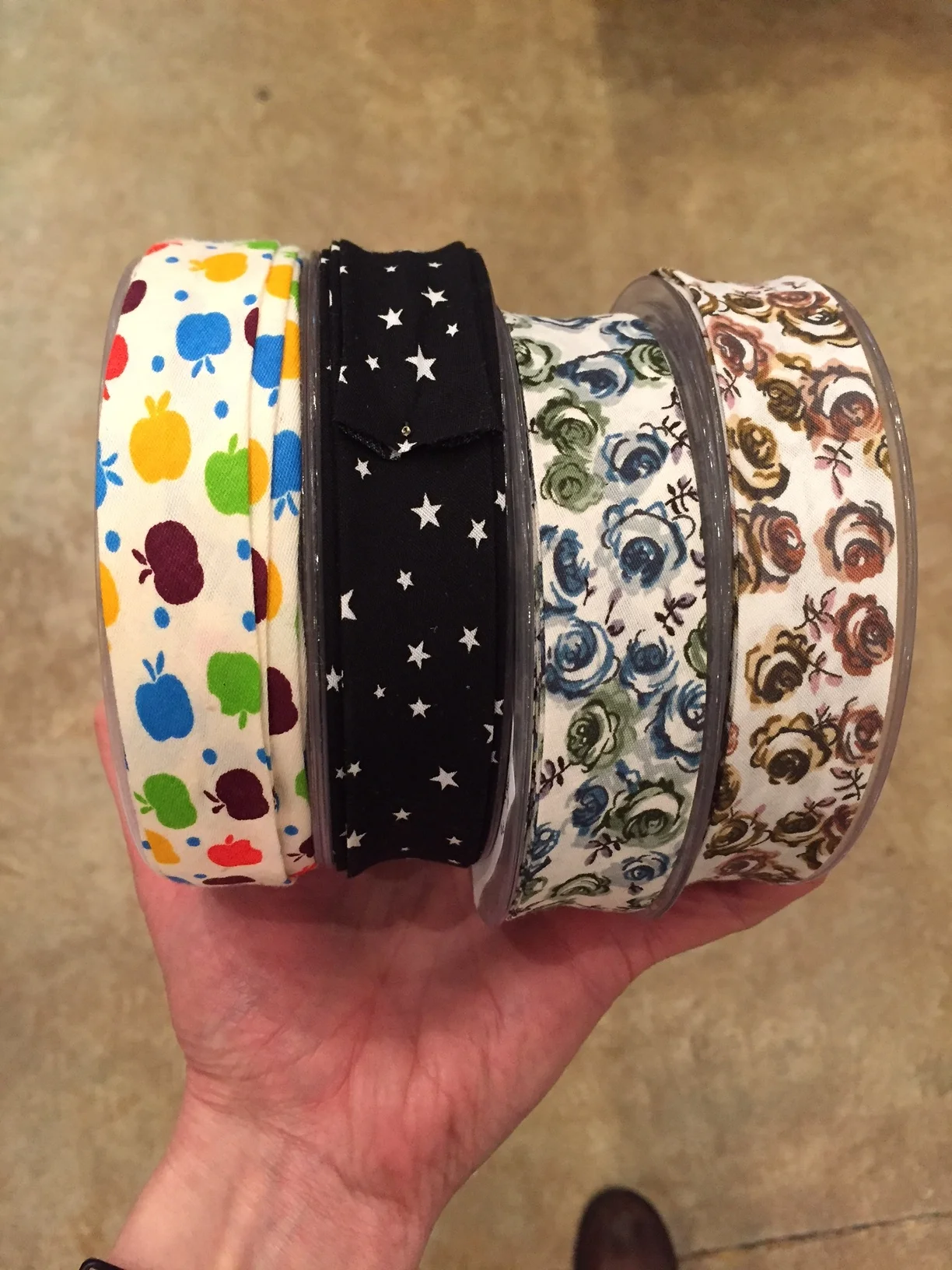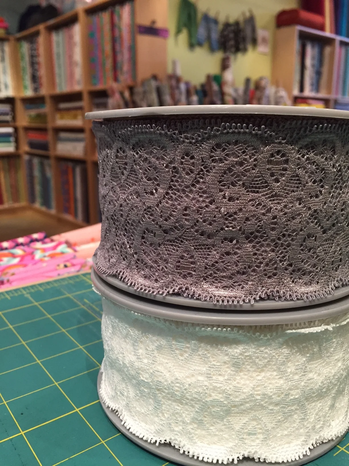 New trims include these two lovely stretch laces and fun, floral and fruity bias tapes! More lingerie elastic is on its way, for those of you looking to make your own. It's a great way to use up knit scraps!