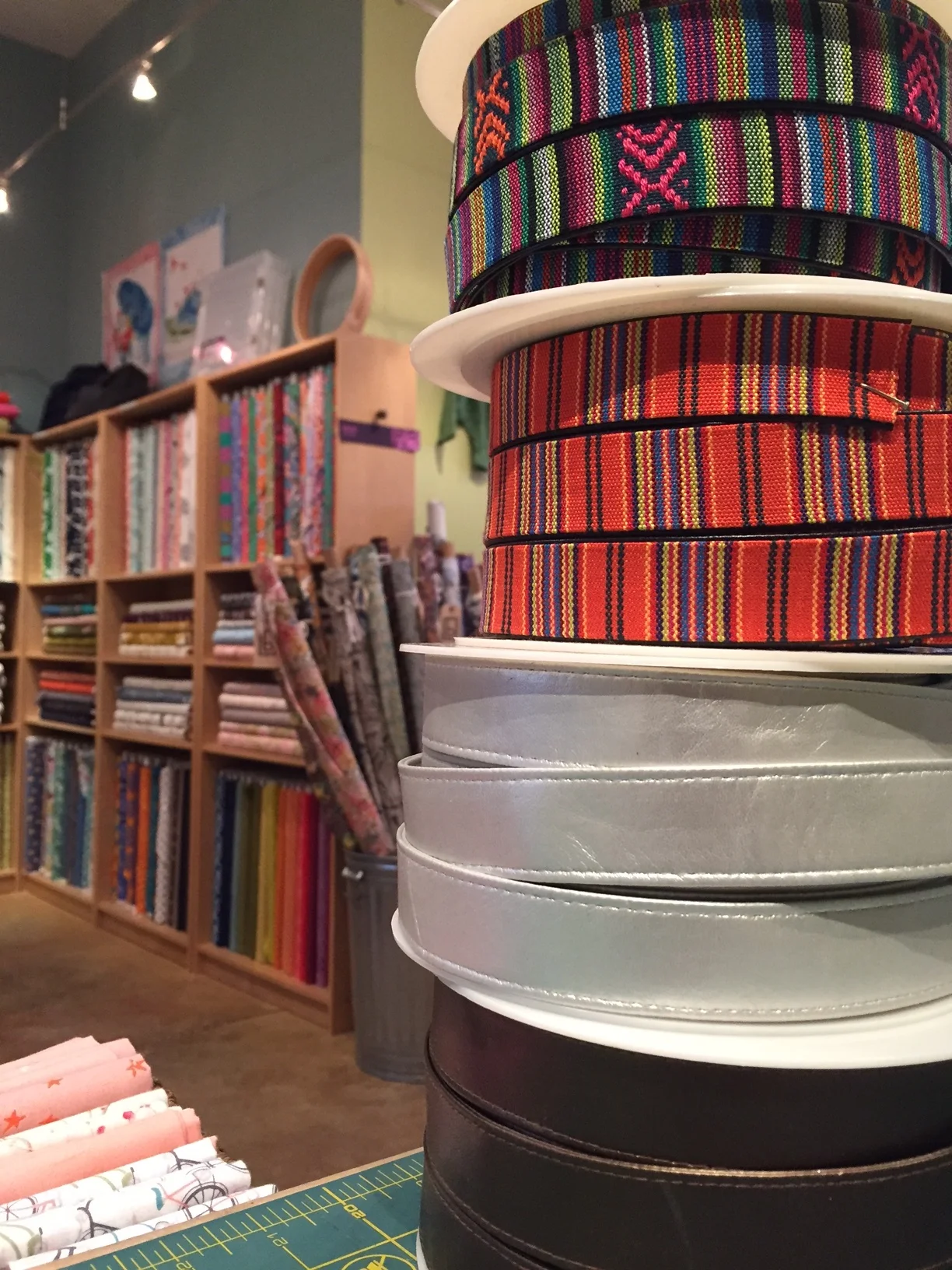 It's quite an assortment of items featured in this week's Just In. We just brought in "pleather" strapping in metallic bronze and silver, as well as these two colorful, stitched strappings.