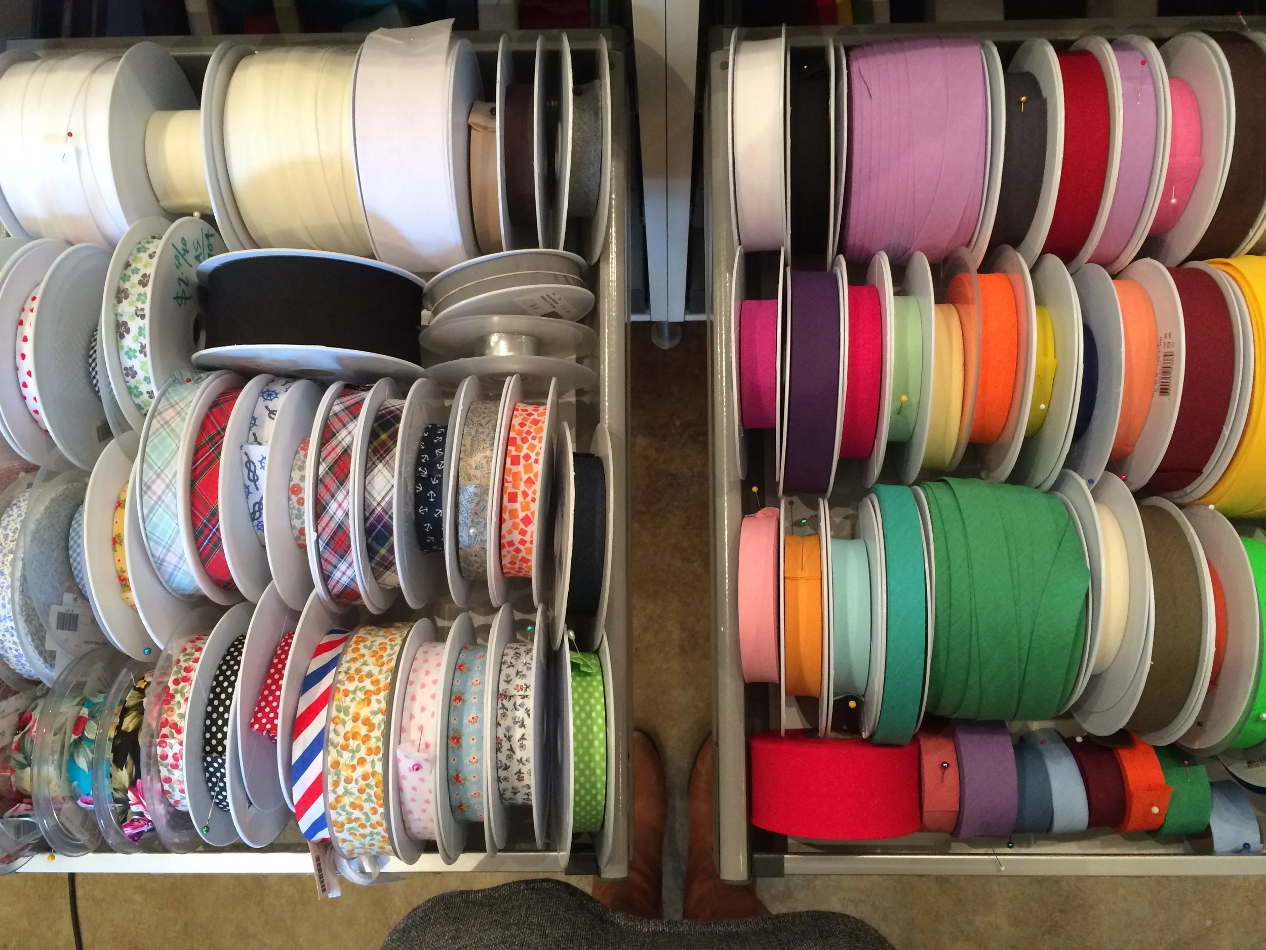 We have so many lovely print and solid bias tapes to choose from right now. I fell in love with these floral beauties immediately. We also have a wide range of appropriate fabrics as well. Everything from fun cotton prints, classic yarn dyed wovens, as well as luxurious rayons and silk blends would make great pajamas. Mix and match patterns and solids to make them your own or surprise someone with a custom pair!