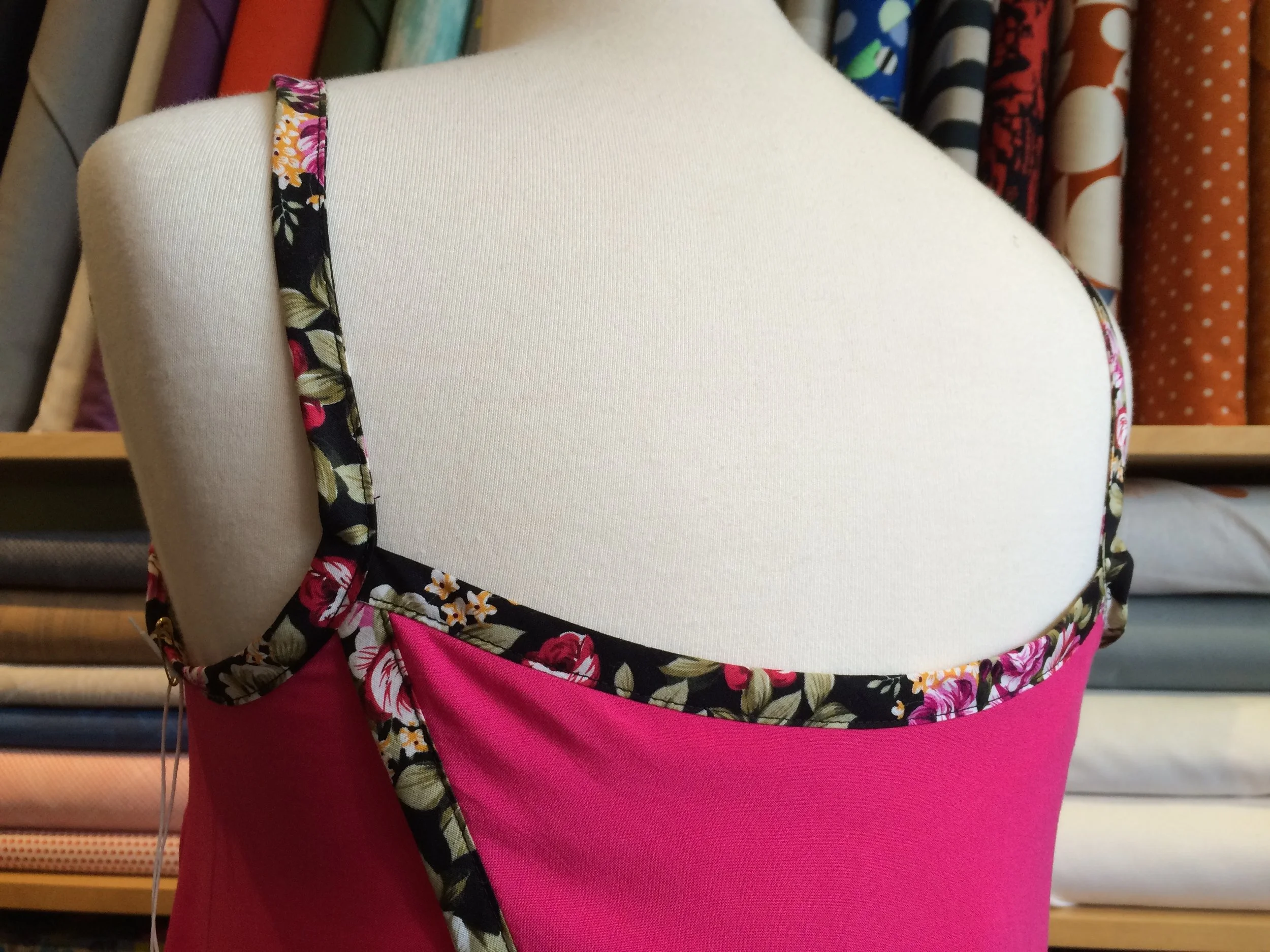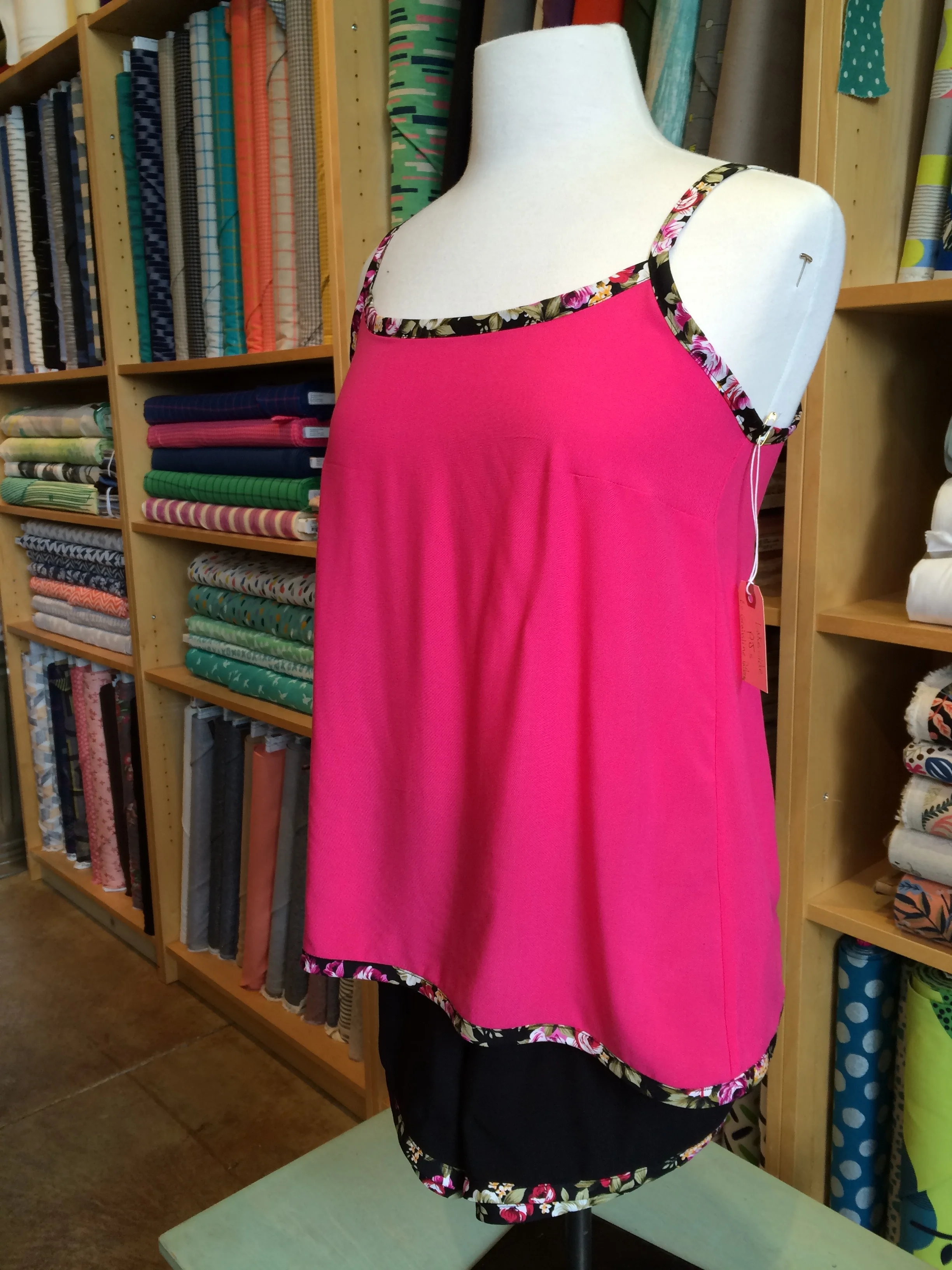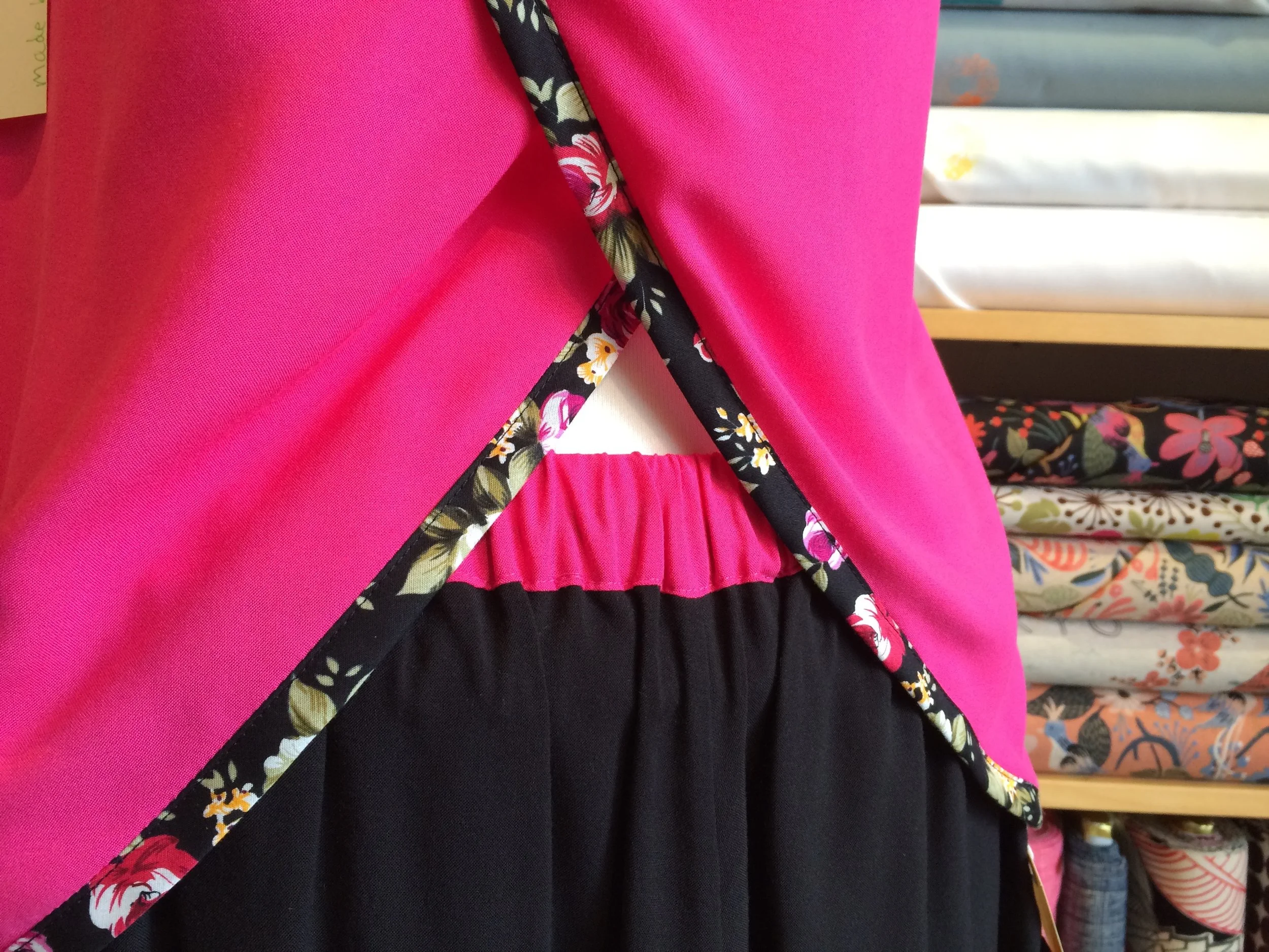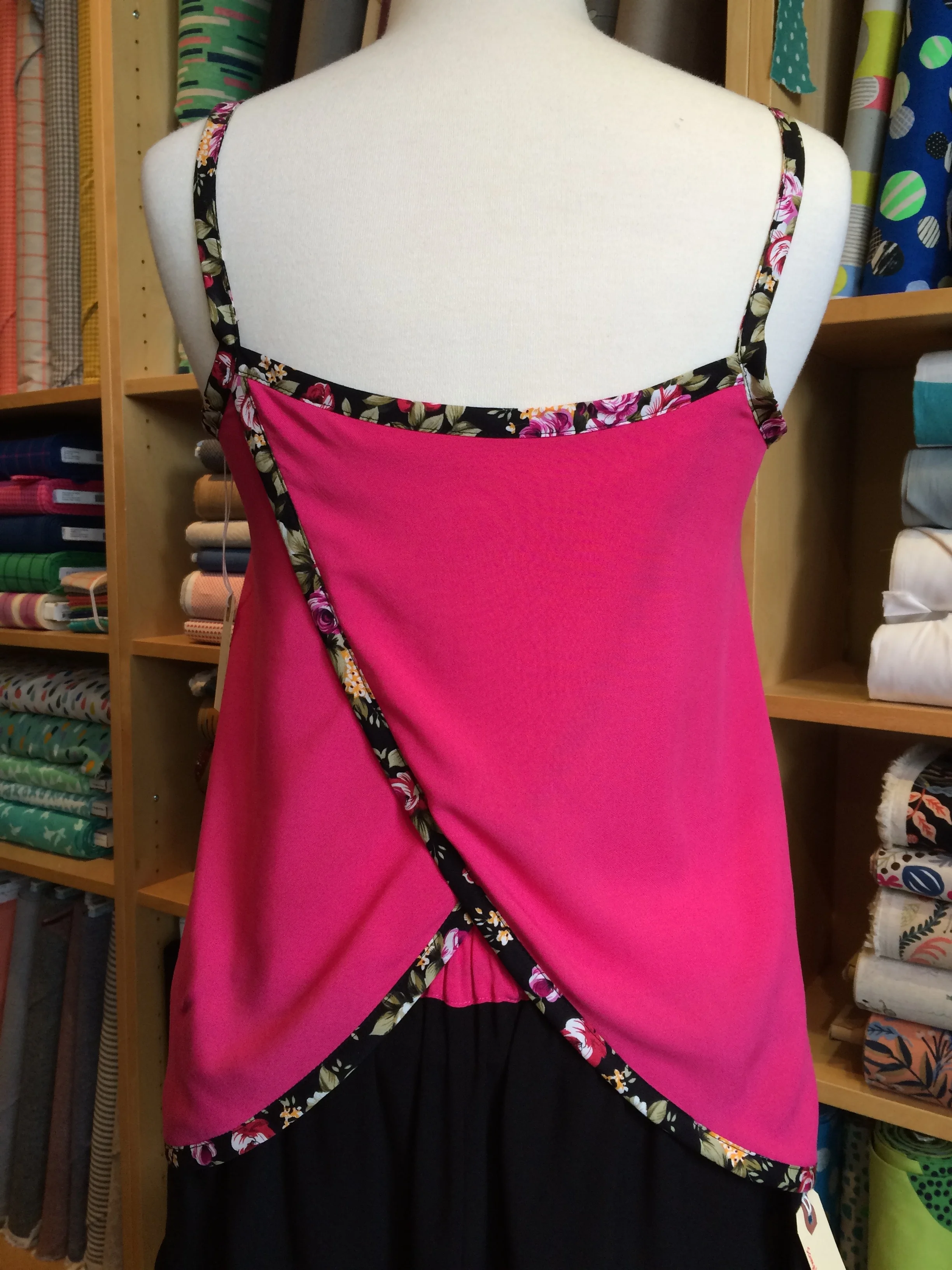 I chose a vibrant pink and classic black rayon challis to pair with the black floral bias. The pattern calls for 1” wide bias strips (also known as 1/2” single fold or 1/4” double fold) which makes for tiny little straps, but you can easily use wider tape like I did. Many of the tapes we have in stock are 1/2” double fold so the straps will be a bit sturdier, but still lovely. This pair was the second pair of Lakeside Pajamas that I had sewn and using pre-made bias made sewing them a breeze in one afternoon.
