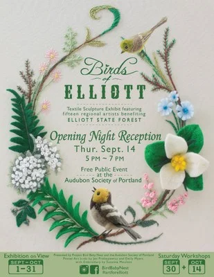 The Audobon Society of Portland will be featuring a free textile sculpture exhibit September 14th and through October. The exhibit is inspired by Elliott State Forest and its bird inhabitants and features the work of 15 artists, many of whom will be attending. Refreshments will be served on opening night, 5-7pm and neddle felting kits for making bird ornaments will be available for purchase. Click here for more information http://audubonportland.org/about/events/opening-night-reception-birds-of-elliott-forest-textile-sculpture-exhibit