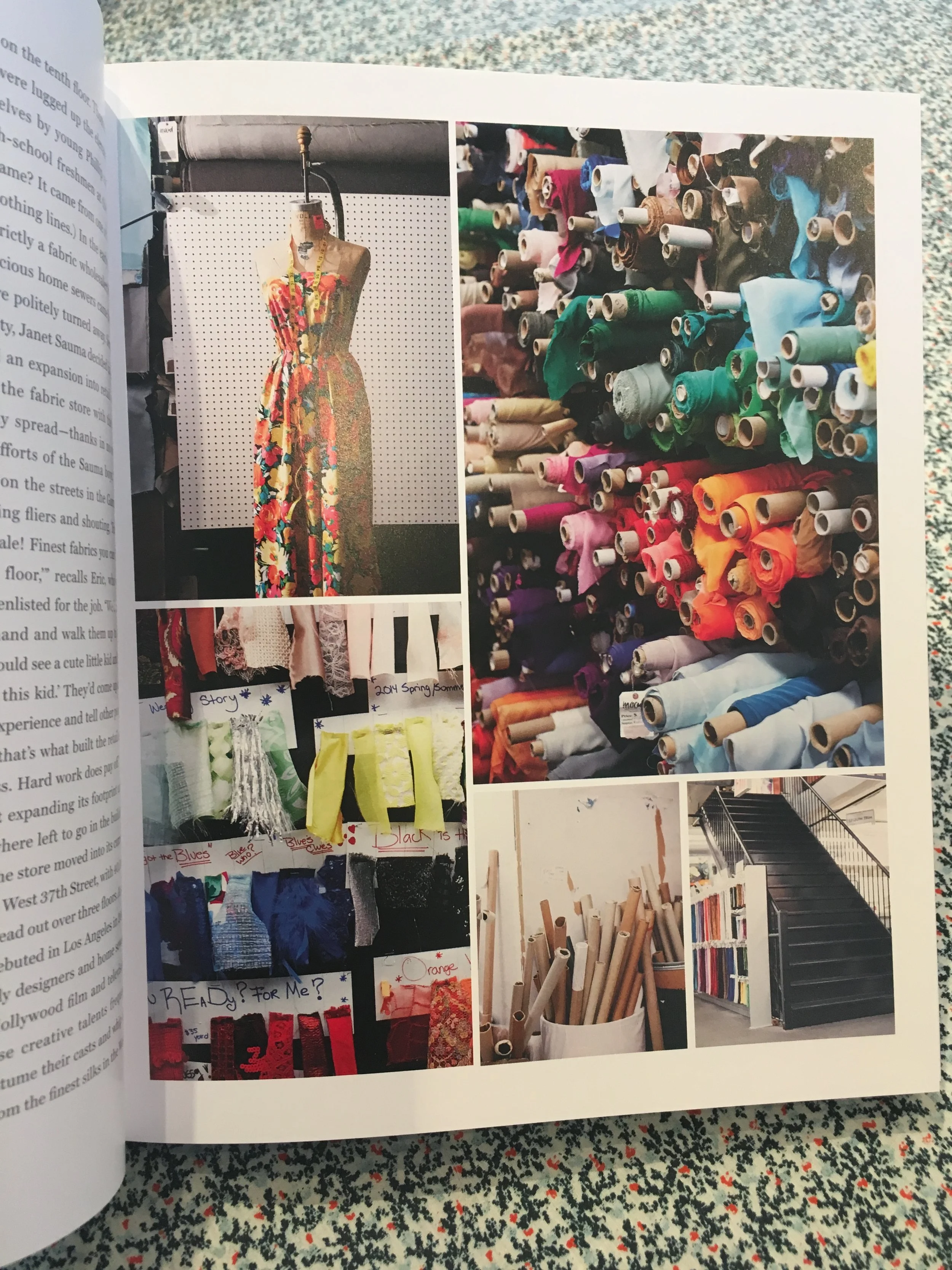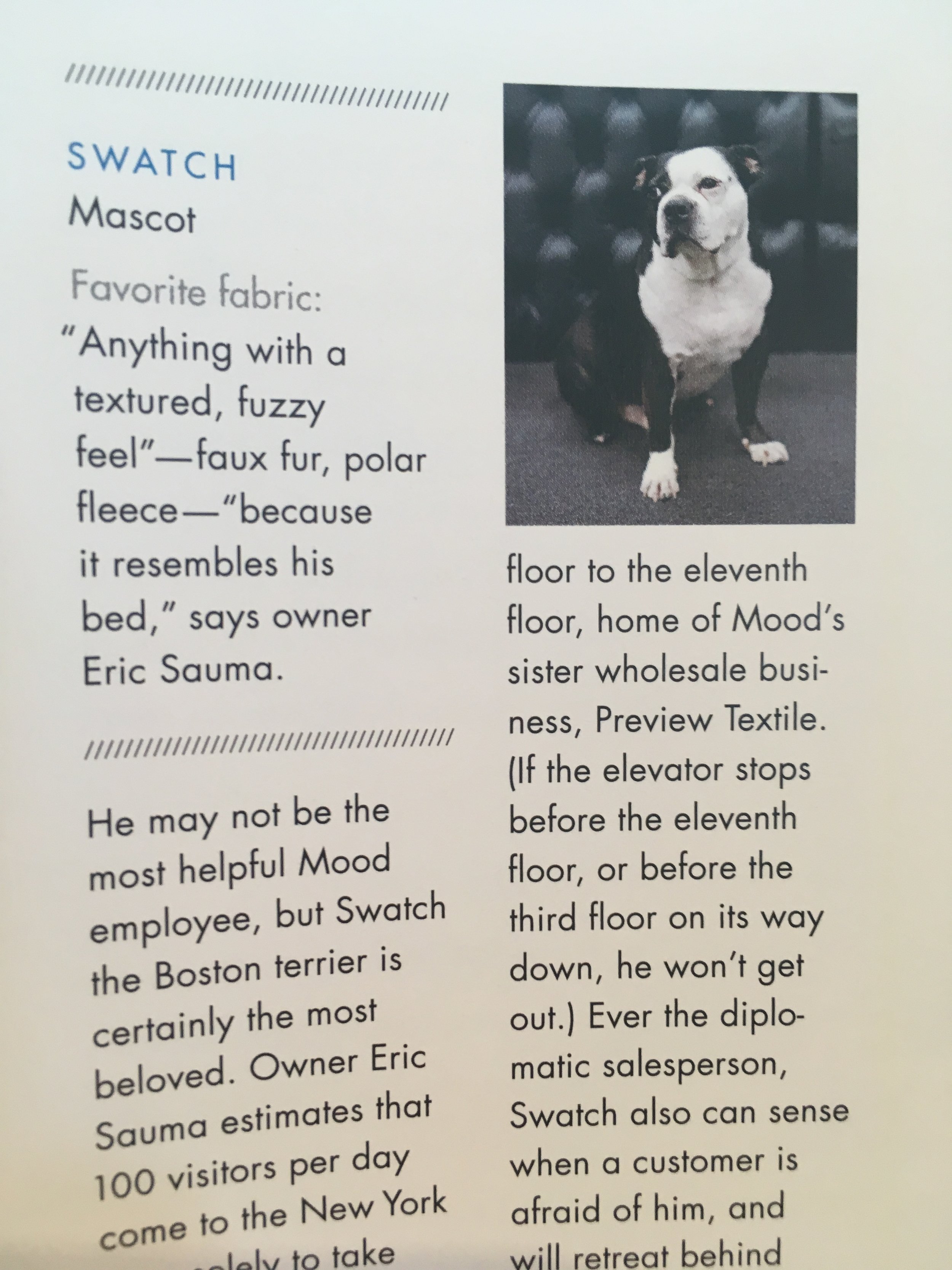 Mood's shop dog, Swatch, is featured in the book too! I love Swatch, he was very kind in helping me locate the knits when I visited Mood.