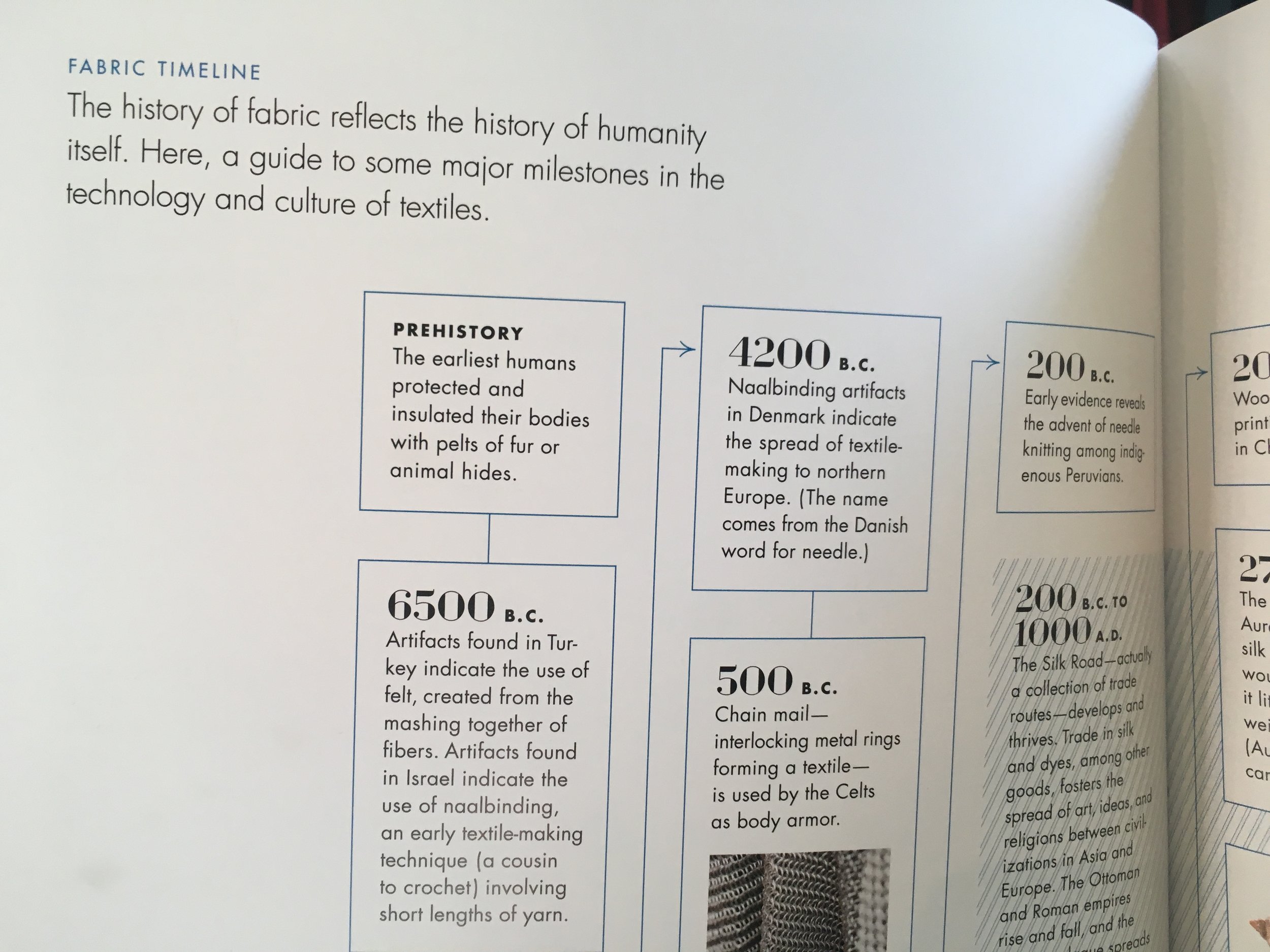 It features a timeline of fabric history. Did you know that roller printing came about in the year 1785 and that this method of printing fabric is the one most commonly used today? There is also a cool map showing where certain fabric types are commonly produced.