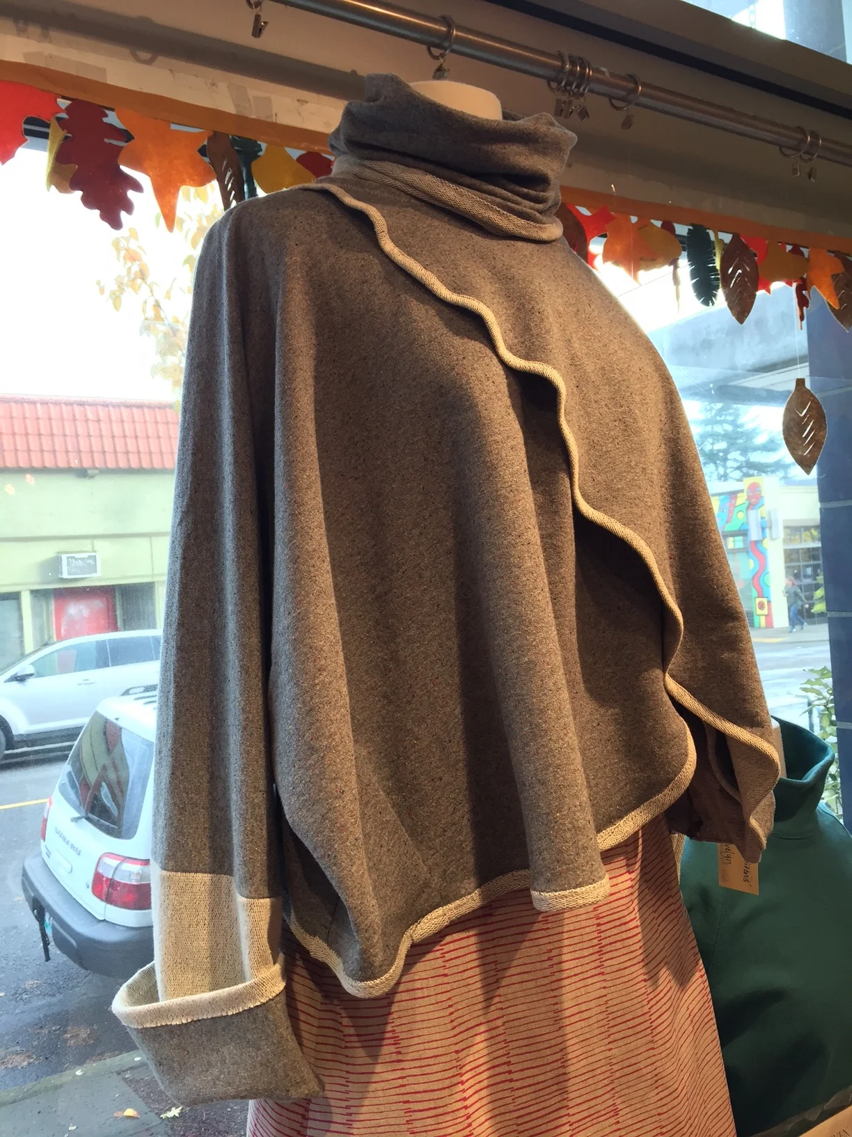 Let's show off what we've got, shall we? In the top photo are Tina Givens' Evelyn crop top and Sew House Seven's Toaster Sweater. The Evelyn top has unique lines, with a curved, overlapping front, long cuffs and swinging hemline. Sarah really used the fabric we chose for great affect, showing off the "wrong side" on the cuffs and around the edges. You all have been loving the Toaster Sweater by Sew House Seven. This pattern offers up two distinctly different styles. This version has the stand up collar, wide band at the bottom. Super cozy and nice for layering.