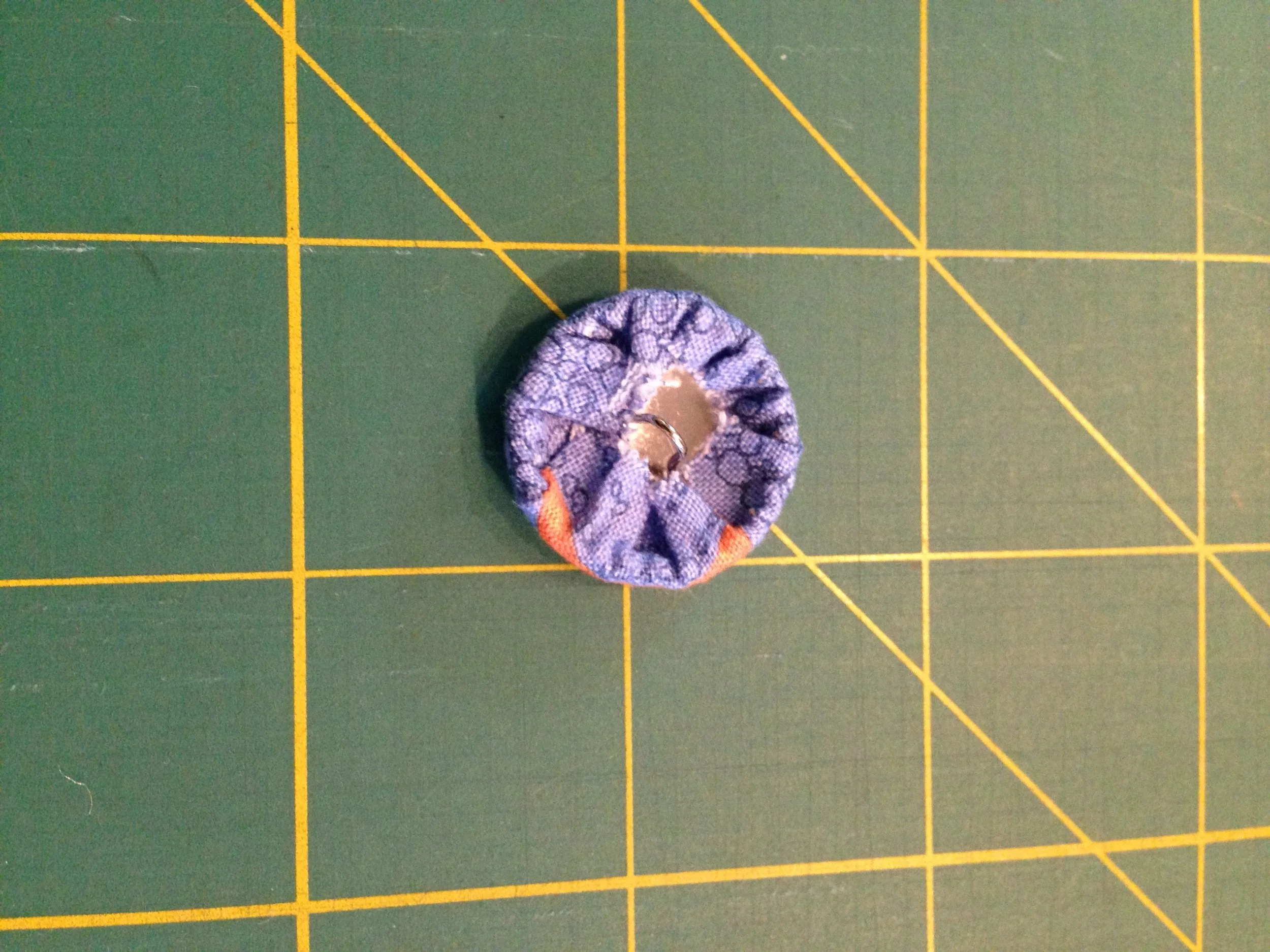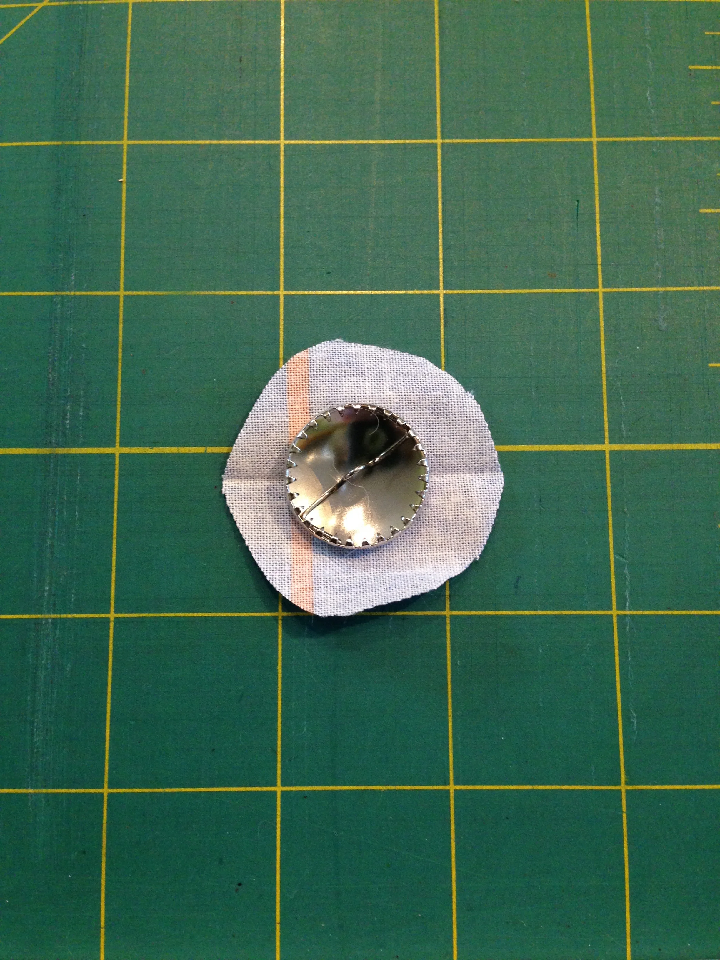 Center your button top over the fabric. Wrap the fabric around the button. There are small metal teeth to catch and hold the fabric.