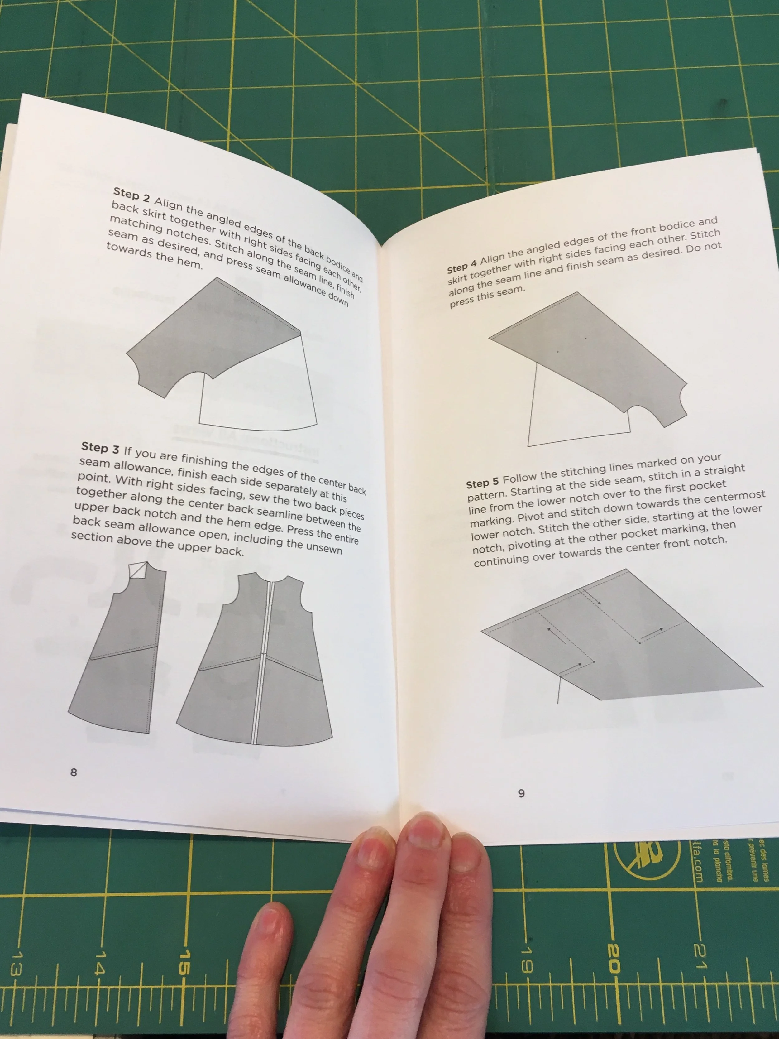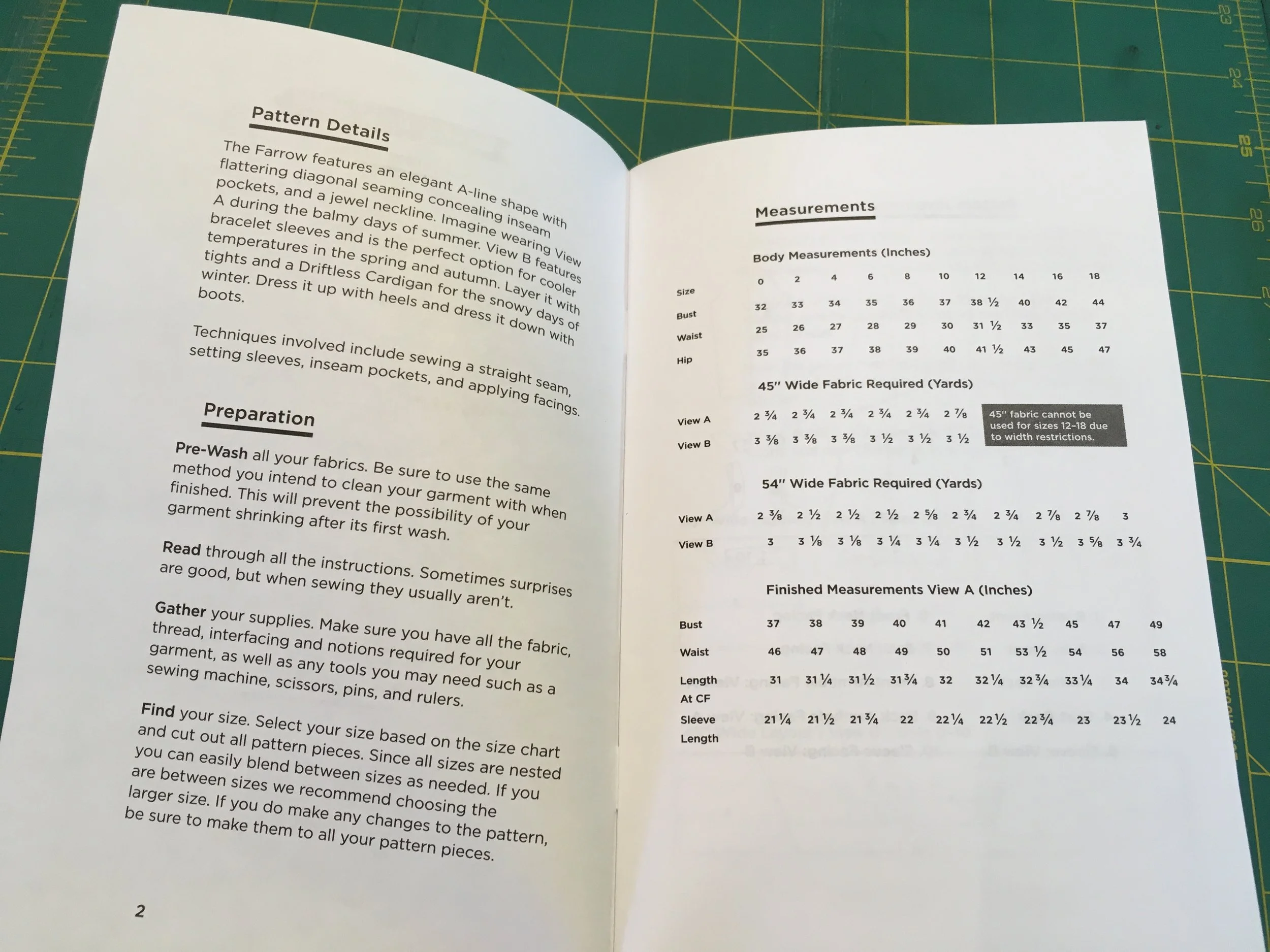 Sizes range from 0 to 18 and there is a generous amount of ease in the silhouette. And for those of you who dislike inserting zippers rejoice because there isn't one! There is a slit at the upper back that is secured with a hook & eye, so you can just pull it over your head.