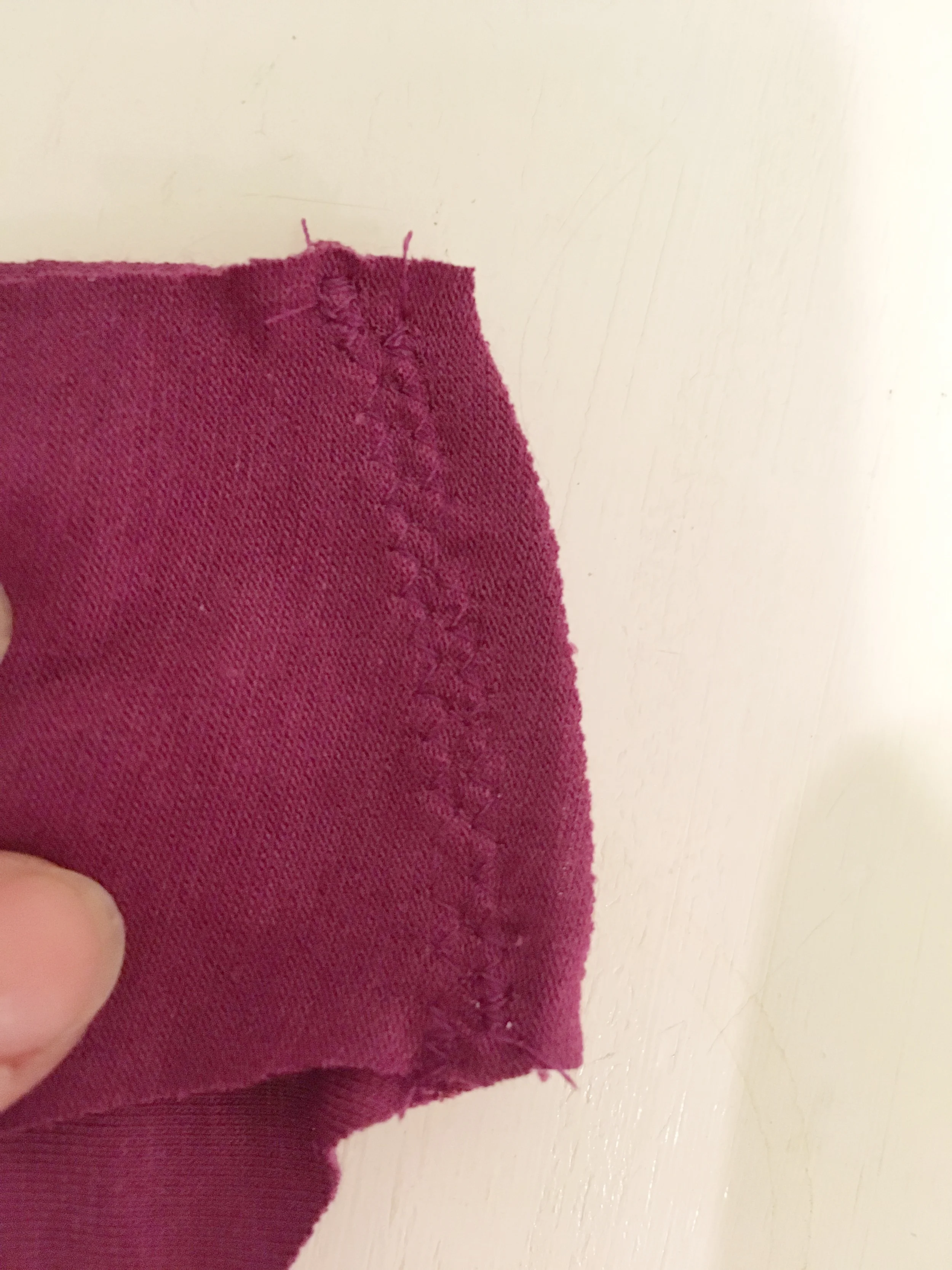 I allow a little more for seam allowance than what most knit patterns call for, because I think most assume you have a serger and their seam allowances can be as little as 3/8". (note: this does not mean I added seam allowance when cutting my pattern out) I also went ahead and stitched two rows, for a stronger seam. Sergers overlock raw edges making a super secure stitch and finish, something a regular sewing machine cannot do. So, for piece of mind, I like to stitch in a little bit more from the raw edge for better durability. It is also very hard to stitch that close to the edge with jersey, it stars to get a mind of its' own. Scary!