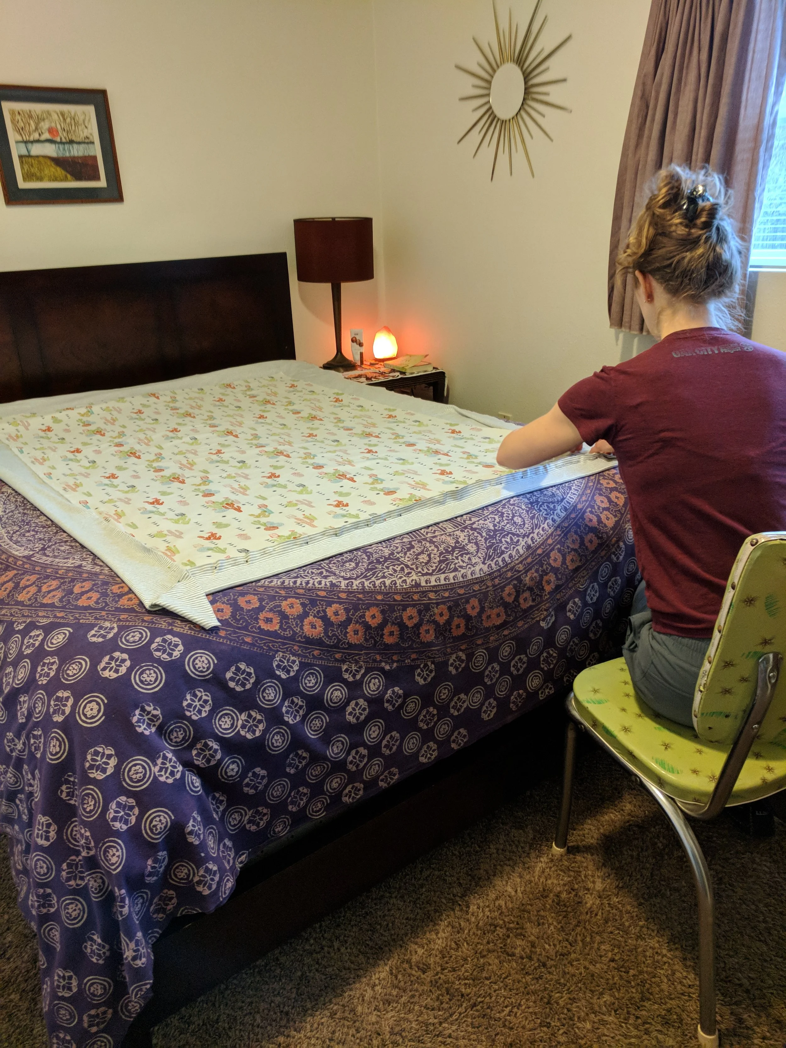 I wanted my throw to be long enough to cover all of my feet (not that I have more than the standard two, but you all know how ready made throws are always way too short) and to puddle generously around my neck. I cut 2.5 yards of knit and 2.25 yards of lawn. After I washed both of the fabrics I laid them on top of my bed to where 6" of knit extended beyond all sides of the piece lawn which I positioned face down.