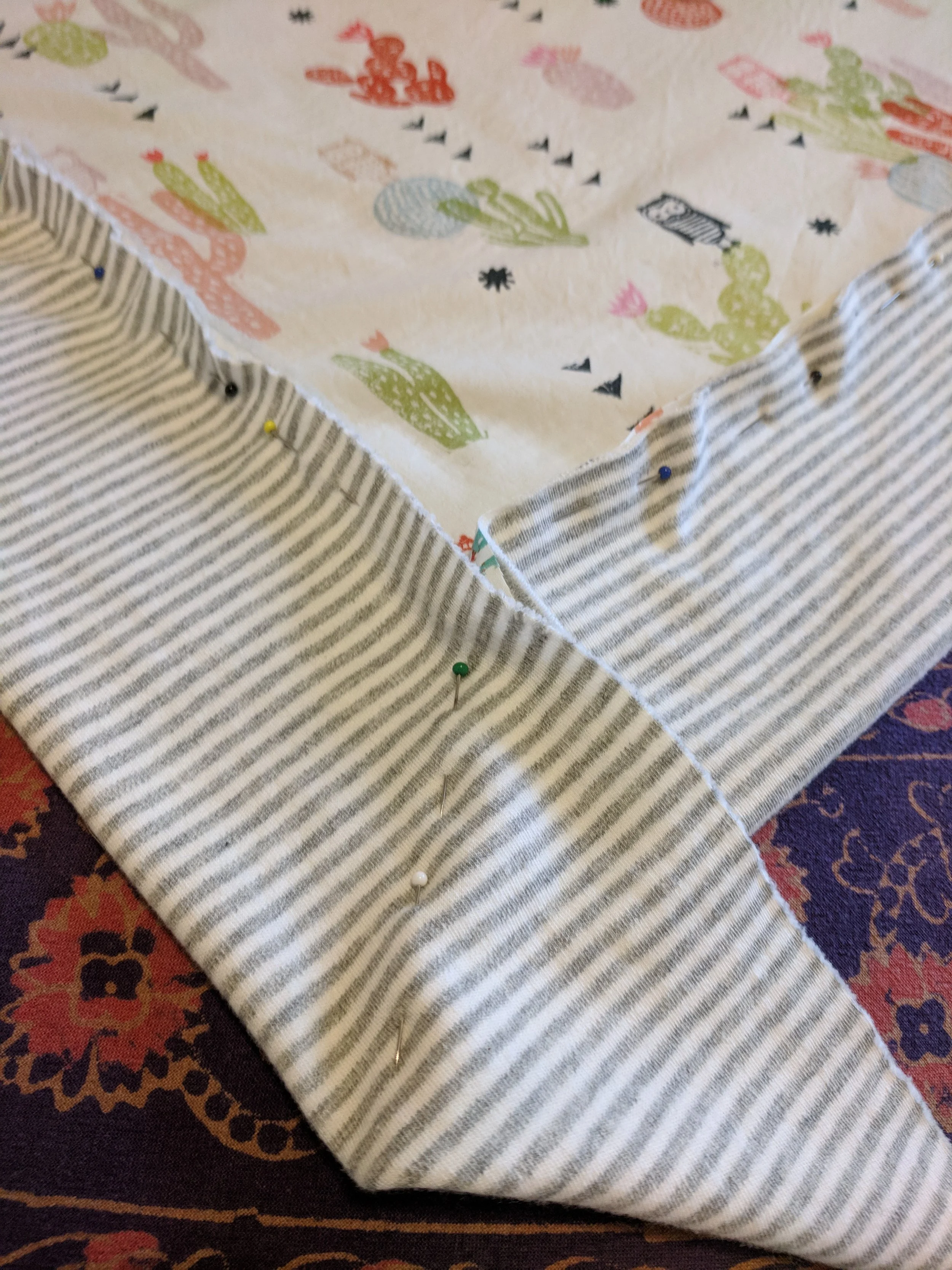 I then grabbed a handful of straight pins and started pinning away and away and away. My method for mitering these corners was freehand style and worked out pretty darn well, I think. After I got it all pinned I then took it to my sewing machine and stitched away and away and away. The more pins one uses the better because the knit stretches out a bit. So to keep from having to painstakingly work the excess in, pin, pin, and pin some more. Or try using a walking foot and see how that works. I then turned the blanket right side out through a 8" hole I had left at the bottom.