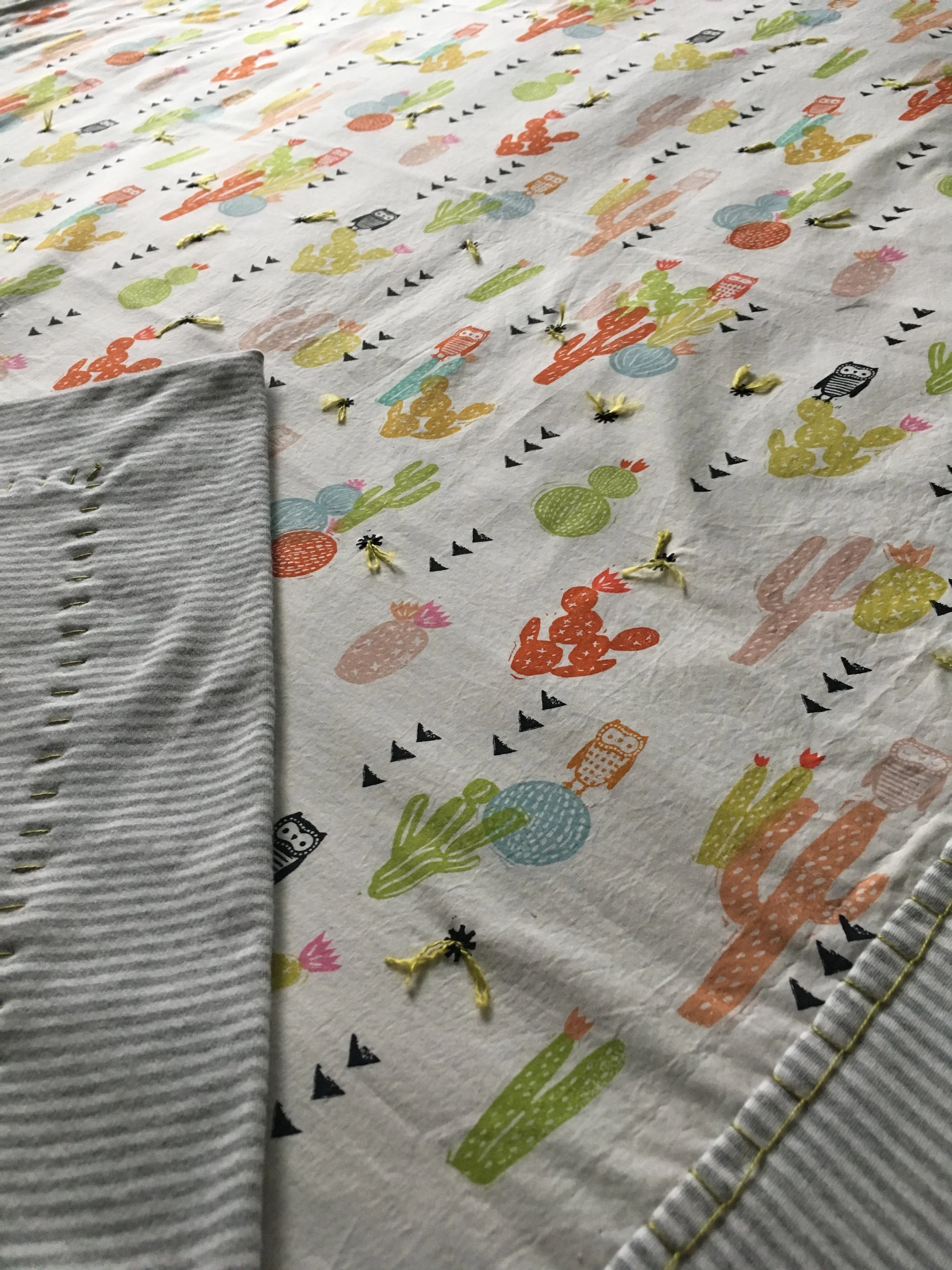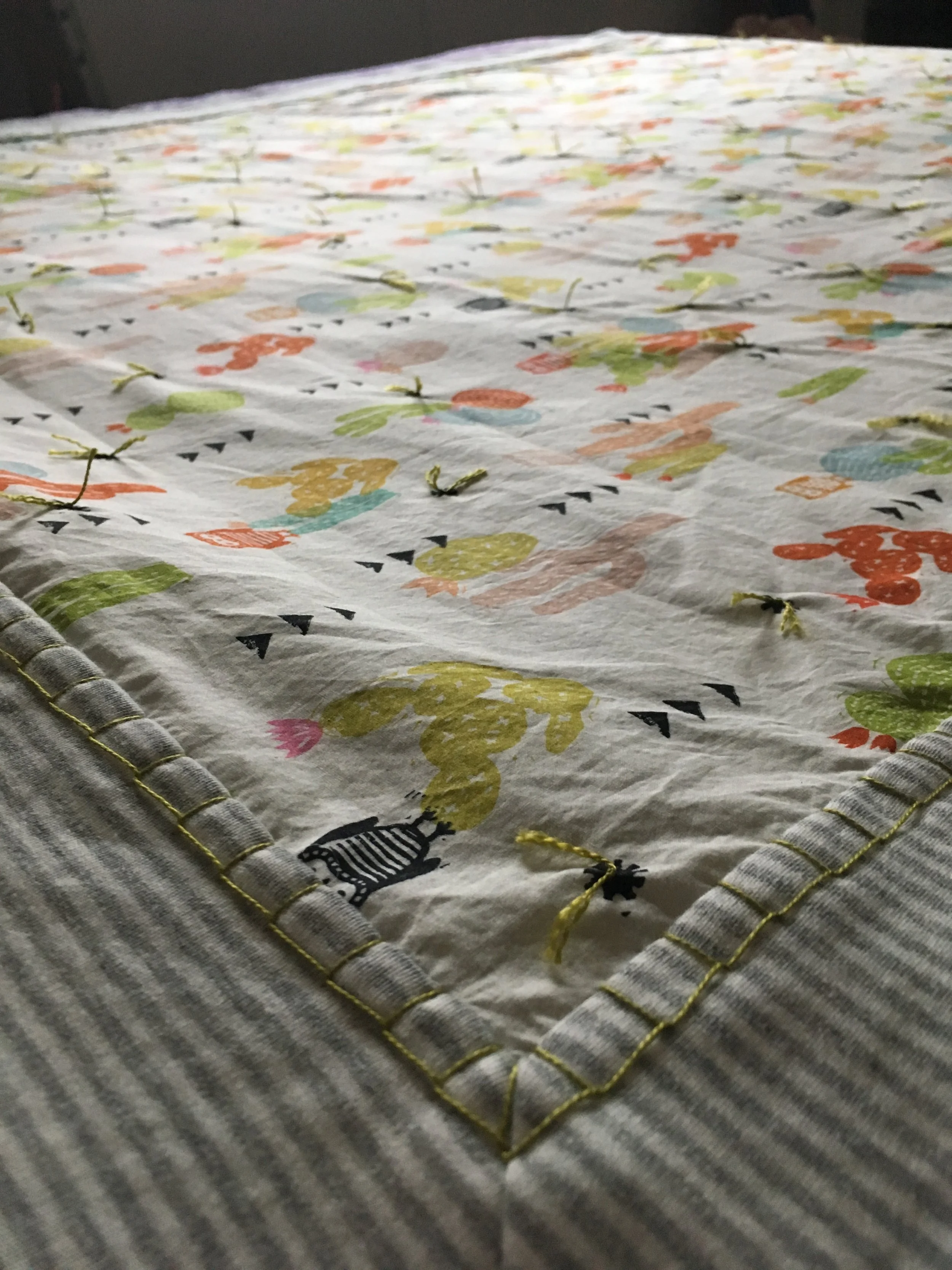 I've been making whole cloth baby quilts and blankets for a long time now and have never actually kept one for myself. This one is all mine but it will be on display at the shop for a few months if any of you would like to take an up and close peek. There is no batting in-between the layers of organic cotton interlock knit and cotton lawn so it is a lightweight blanket suitable for the spring and summer months when the weather gets a tad nippy. The interlock knit provides some nice weight and a soft hand that's sure to comfort.