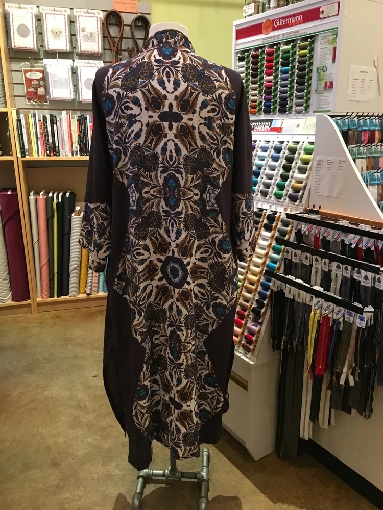 I had a fantastic fabric—a rayon border print. It nearly blew my mind trying to piece it together so that the print matched up and the detail went down the center back, but I managed to do a decent job. I lengthened the pattern to below my knees, extended the side slits to be mid thigh, and added two belt loops for a tie. It turned out to be exactly what I was wanting—a classic, kimono-style robe.