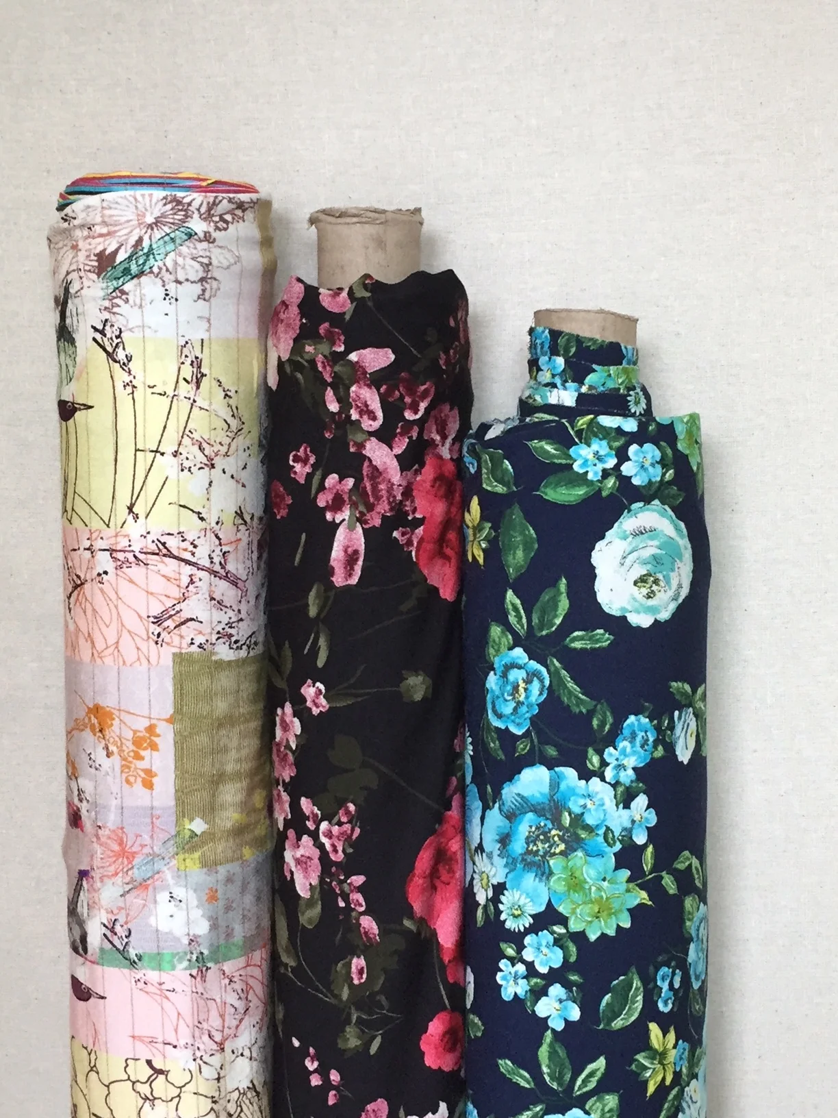 These rayon knit prints from Europe are such fine quality. Their drape is lovely, excellent recovery and soft touch. The Coppelia top by Papercut Patterns would look so sweet in one of these. Check out the rayon prints here.