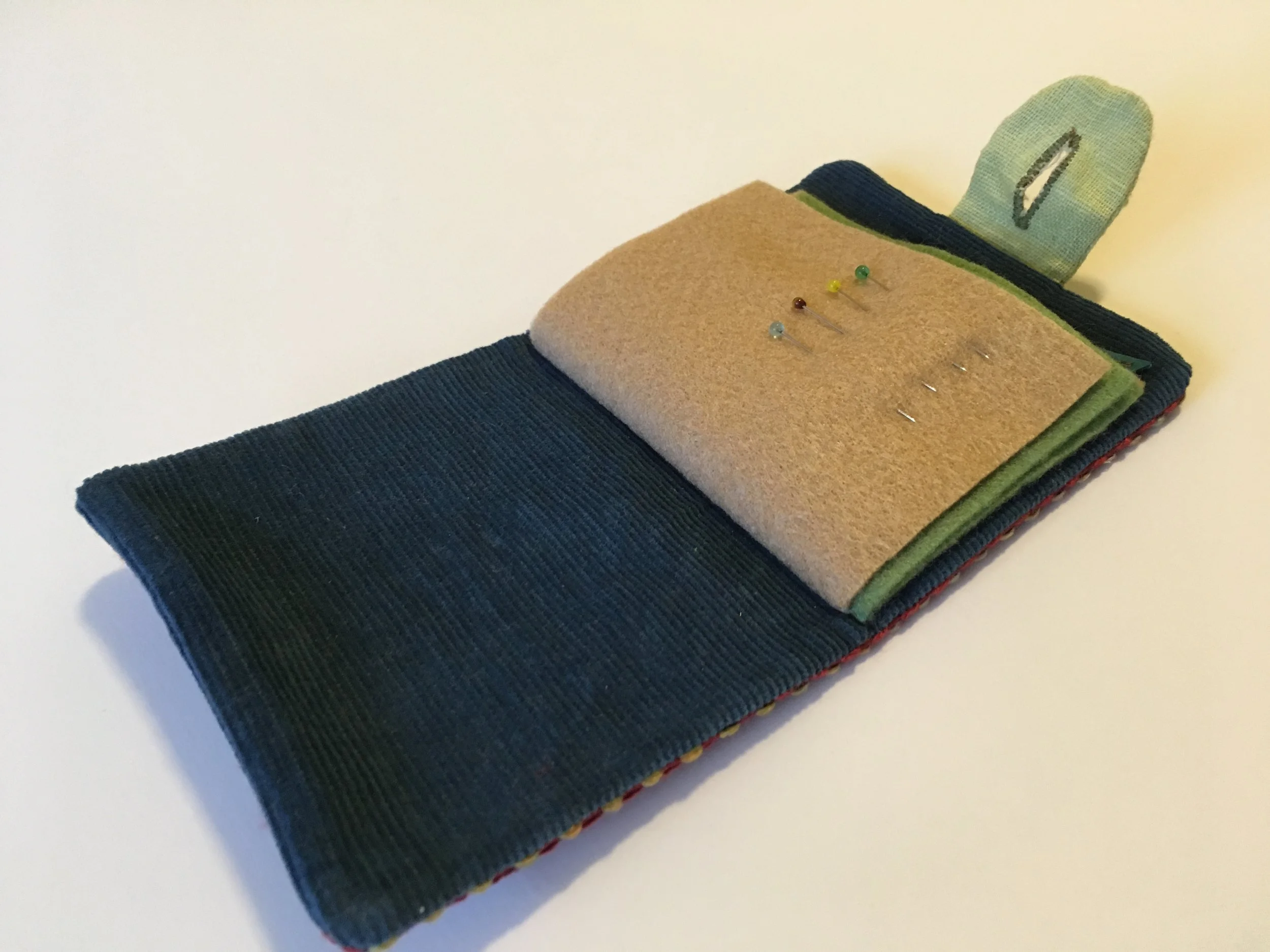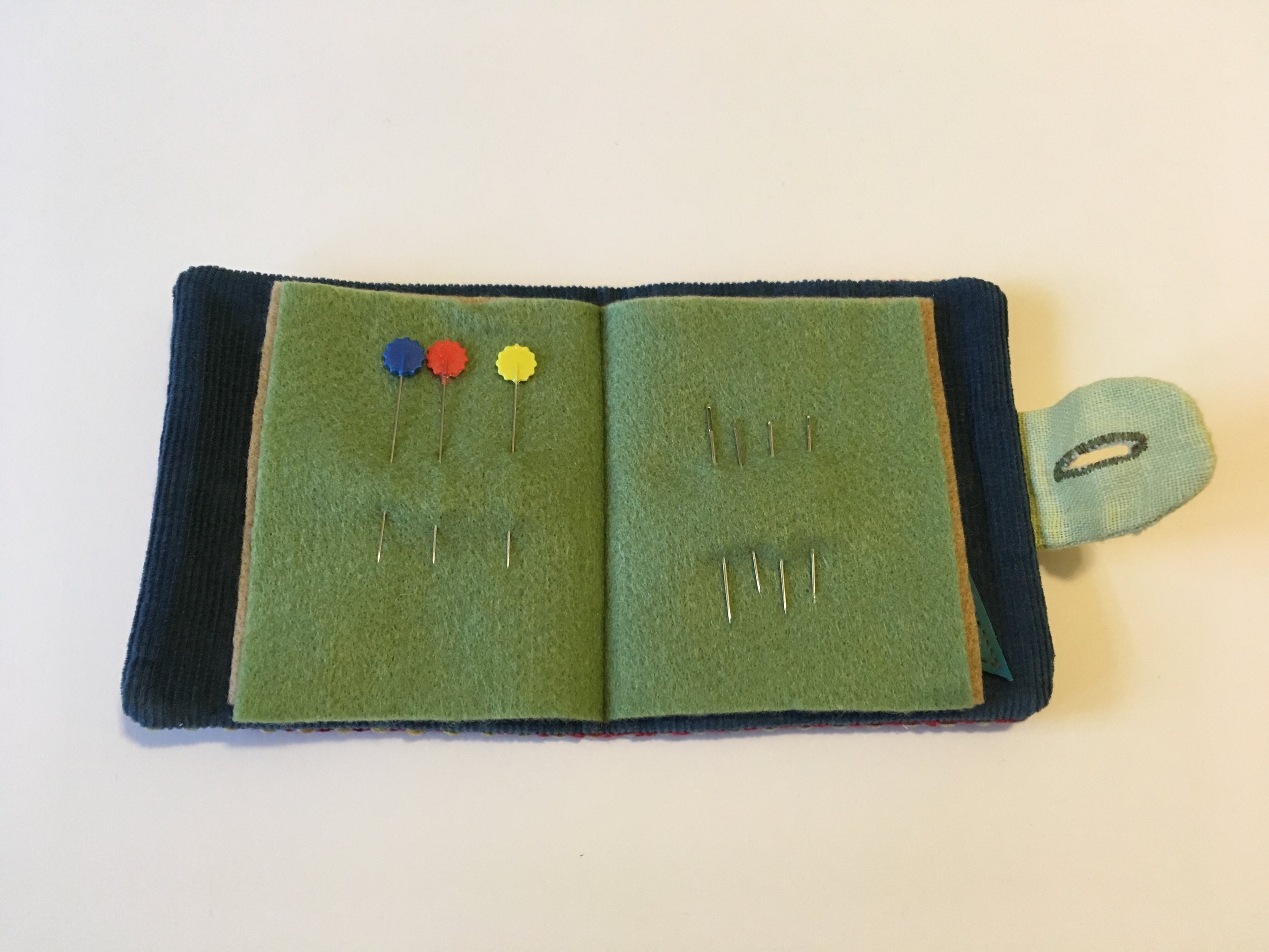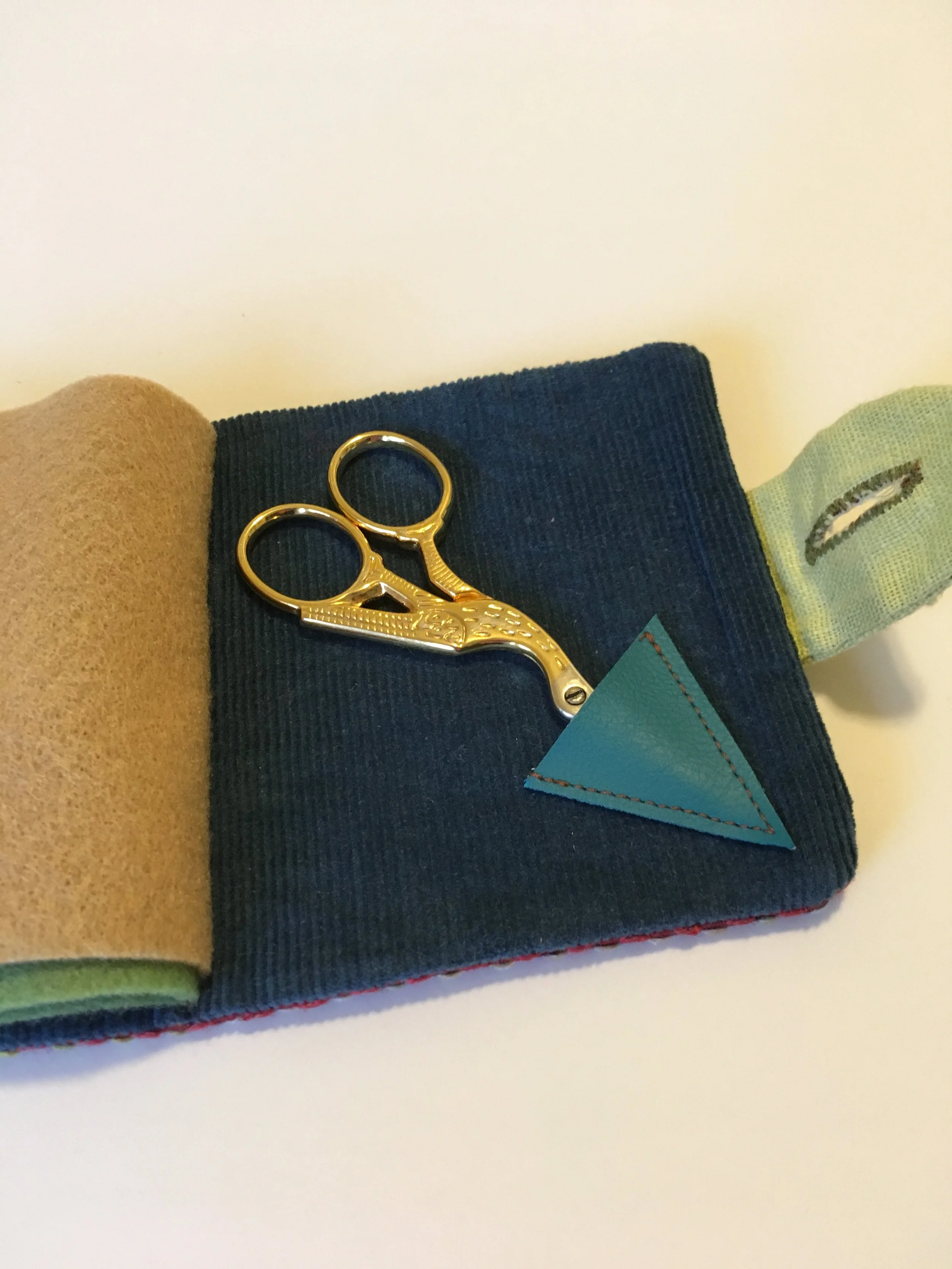 If you wish to carry some small scissors with your needles then add some sort of sheath (I used a piece of vinyl) or holder to encase your particular style of snips.