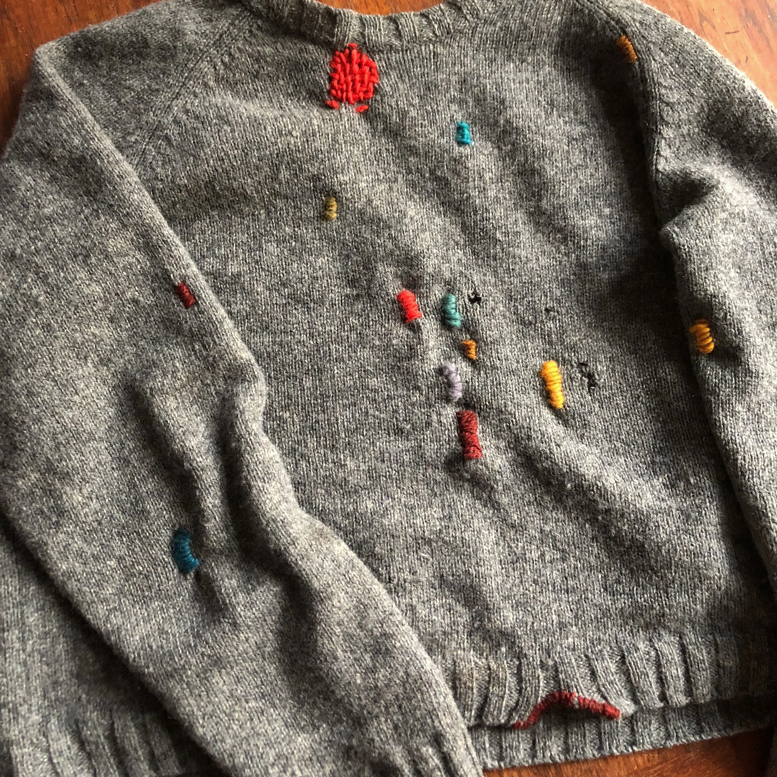 Visible mending is an inspiring and exciting way to bring new life to beloved garments that are worn, torn or in need of repair. Instead of tossing your hole-y wool socks, or that beautiful (moth-eaten) cashmere sweater, you can learn different techniques to repair and customize these items. This is the perfect way to give your garments new life, and create a unique story, while also keeping textiles out of the garbage stream. You get a reinvigorated piece of clothing and you get to feel good about reducing your impact on the planet!