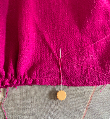 This pattern also has lots of gathers, which makes it feel super romantic. I enjoy using Leila’s (@Leila_Sews) tips on gathers every time I encounter them in a pattern. To help keep the gathers in a section, after gathering to your notches, place a pin at a start and end point of the gathers and wrap the ends of the gathering thread around the pin. You don’t need to do it a ton, but a few times helps secure the thread so you can evenly distribute the gathers without them loosening.