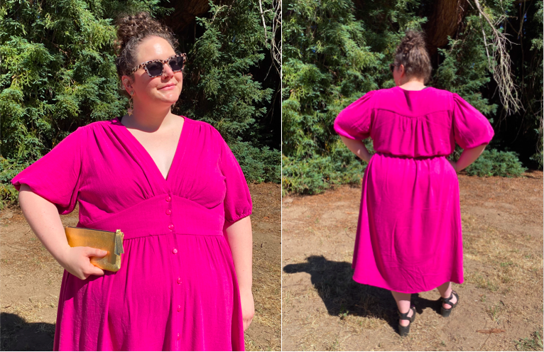 I love the pattern’s v-neckline with delicate gathers, fitted front waistband, and shirred back for extra comfort. What really made this project a dream was the lovely rayon linen slub I picked out from Bolt Fabric Boutique in a lovely magenta color. The fabric is a 70% Rayon and 30% linen blend, which makes it soft and silky, while also handling machine washing well. I made this dress to wear to a best friend’s wedding and the fabric stood up to hours of dancing and didn’t show any sweat. I also found the perfect buttons at Bolt that matched the magenta fabric.